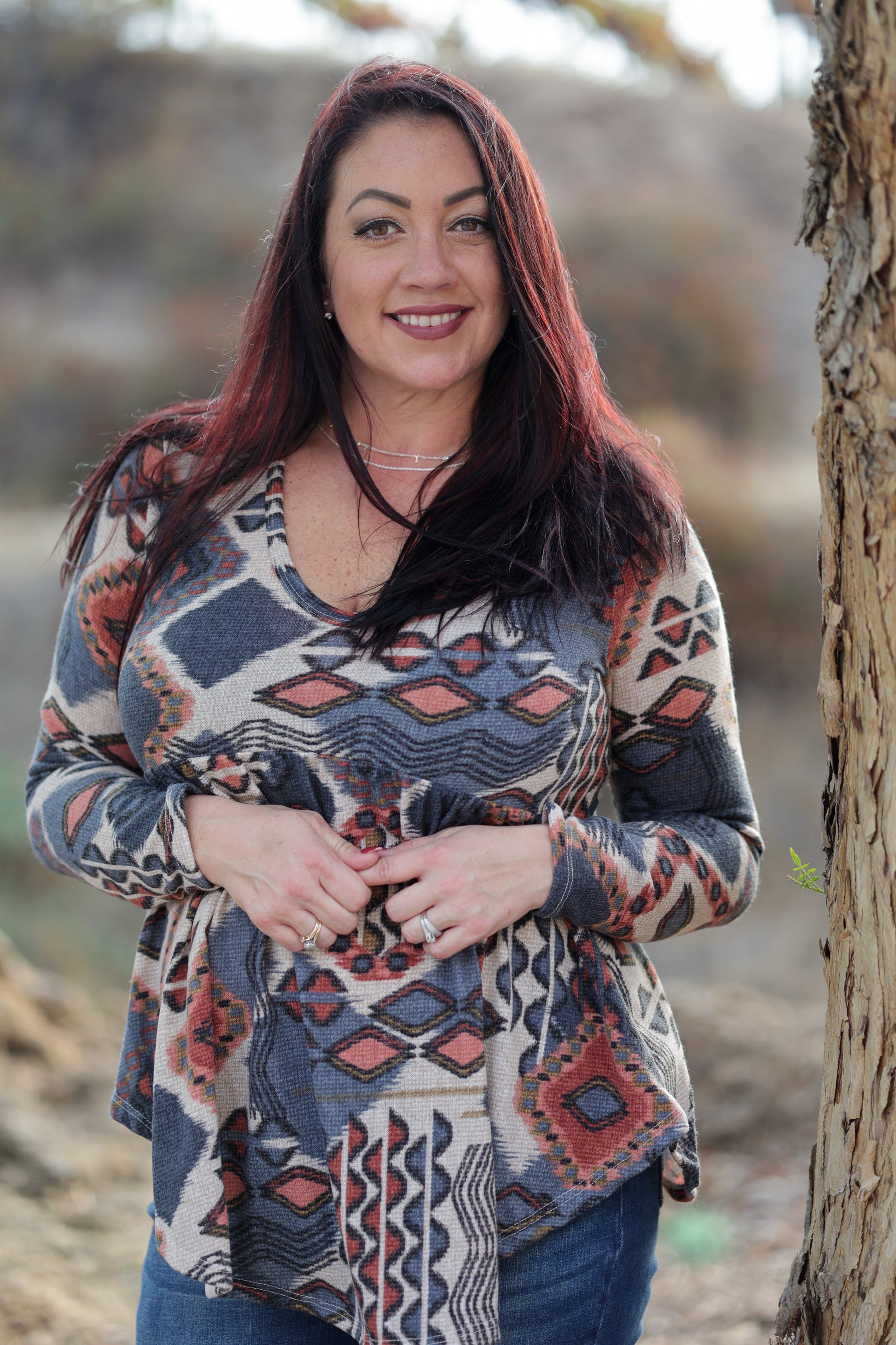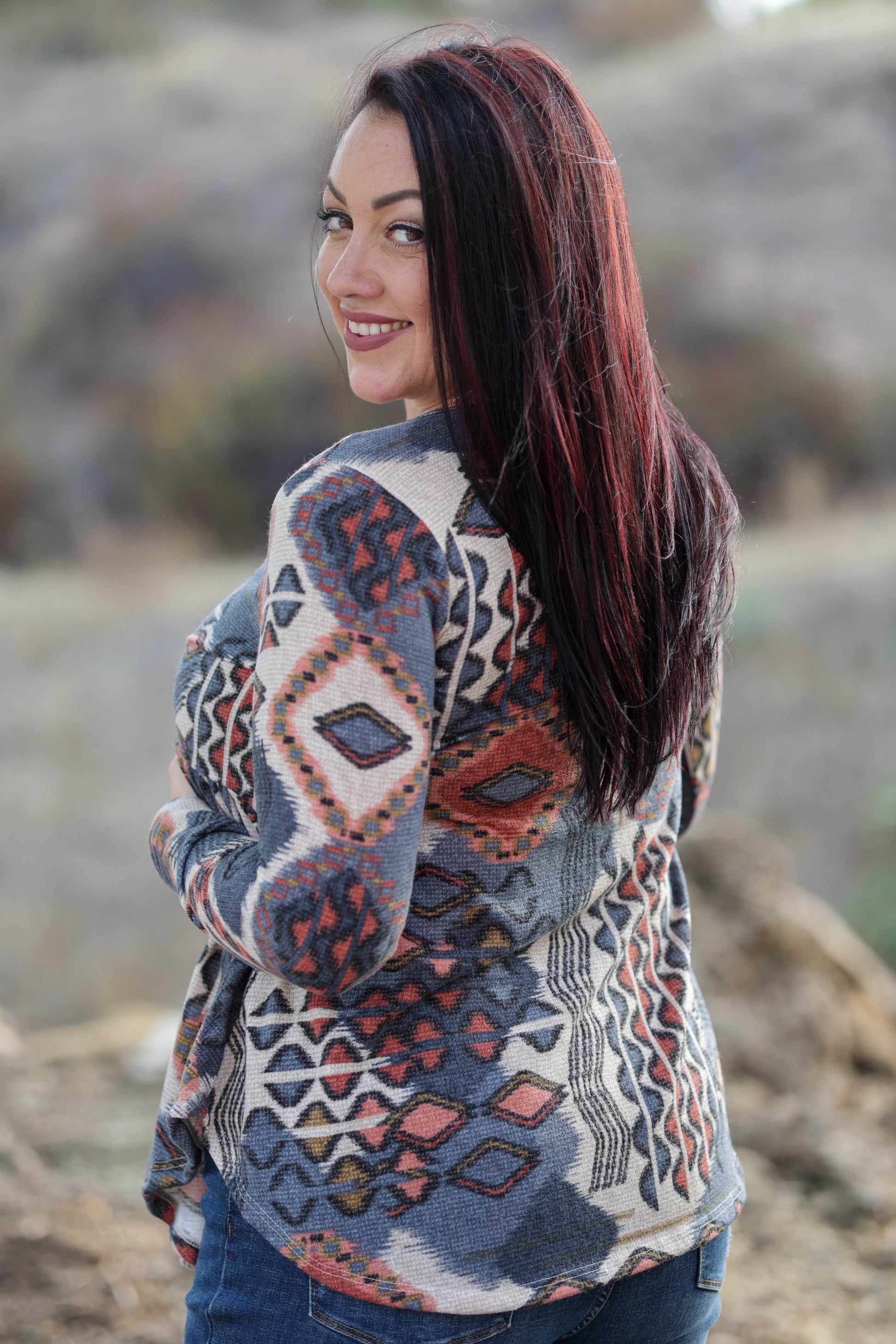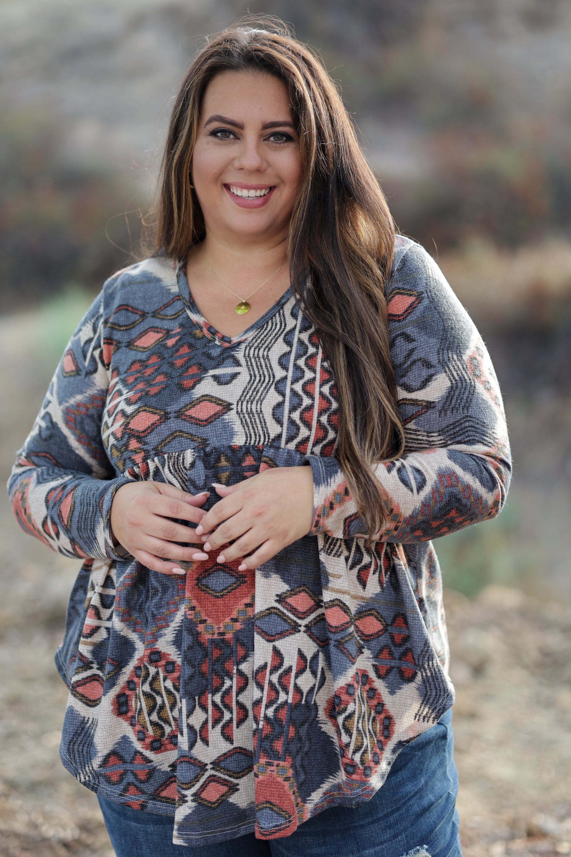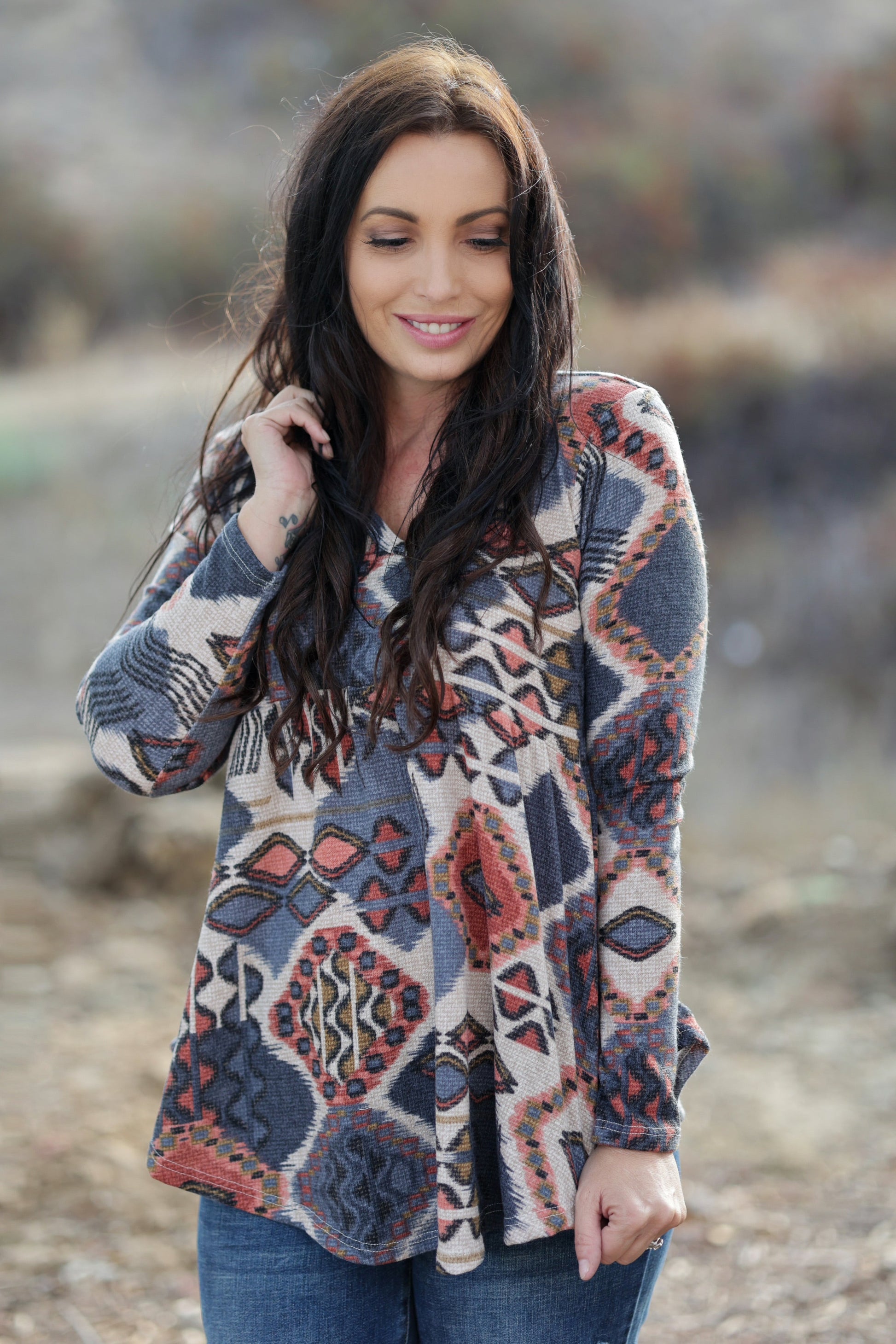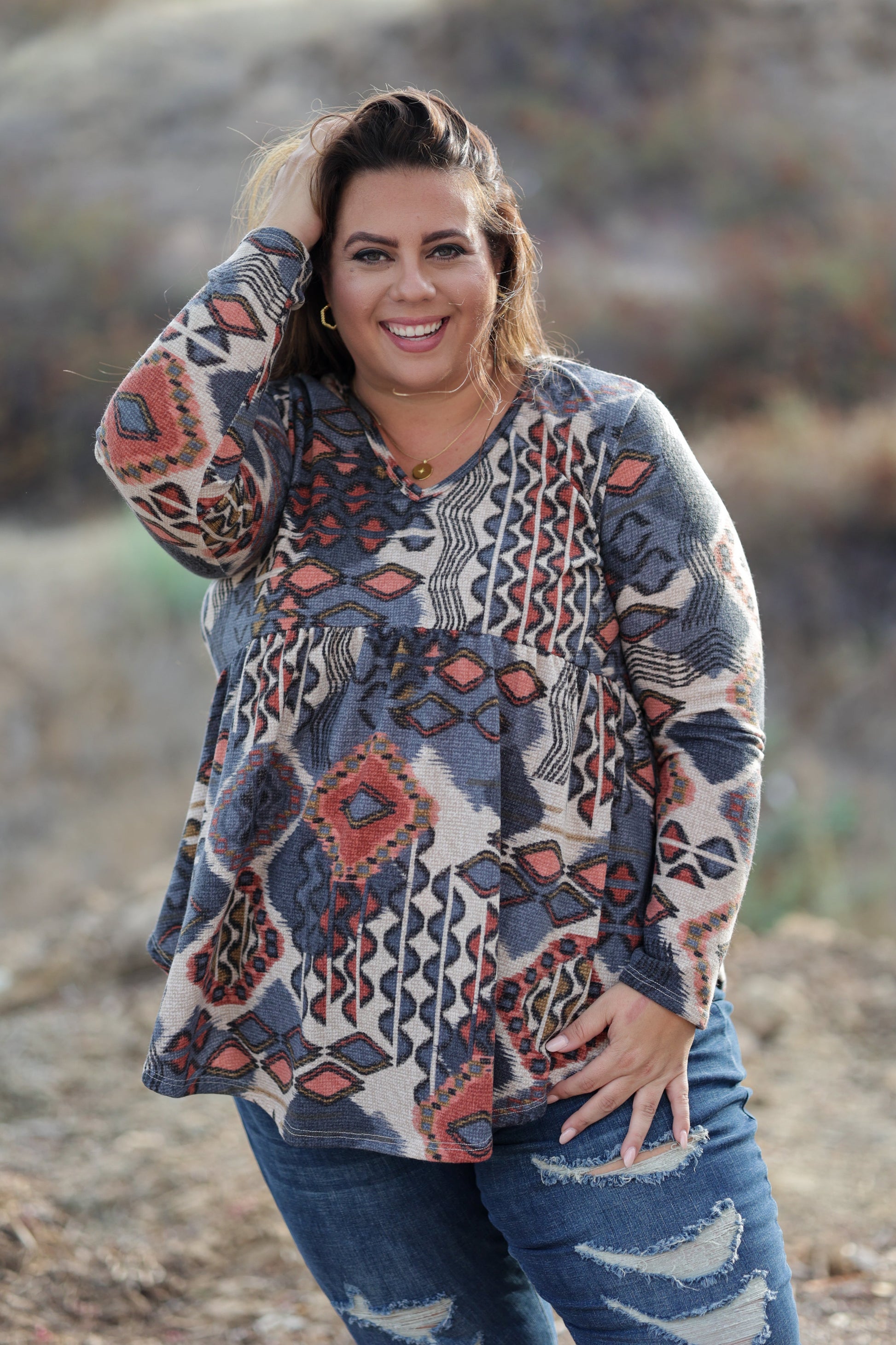 Not only is this babydoll made from the most amazing sweater fabric, but we are obsessed with this one of a kind print on this classic style babydoll. With a relaxed fit, this top features a v-neck, long sleeves and rounded hem.