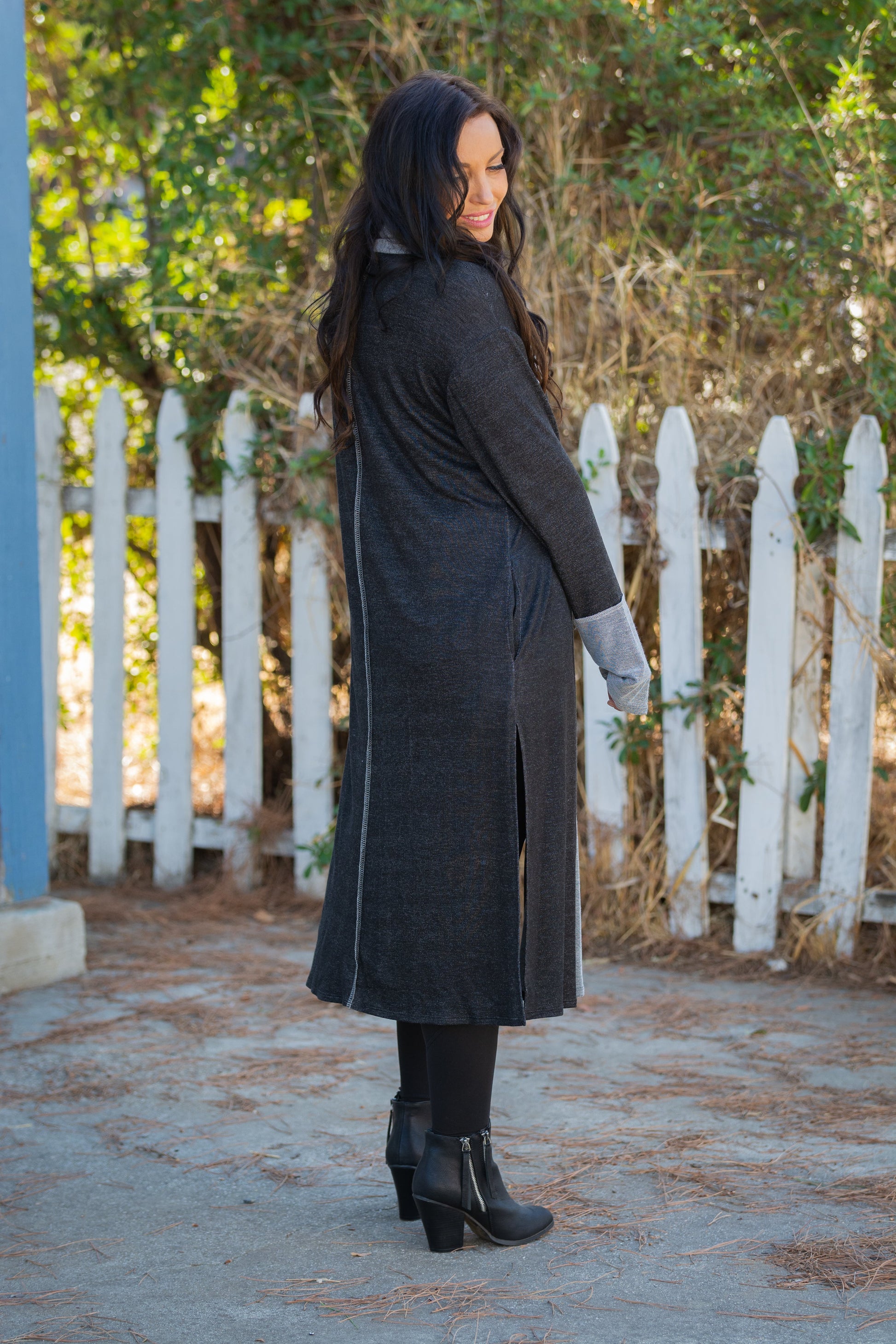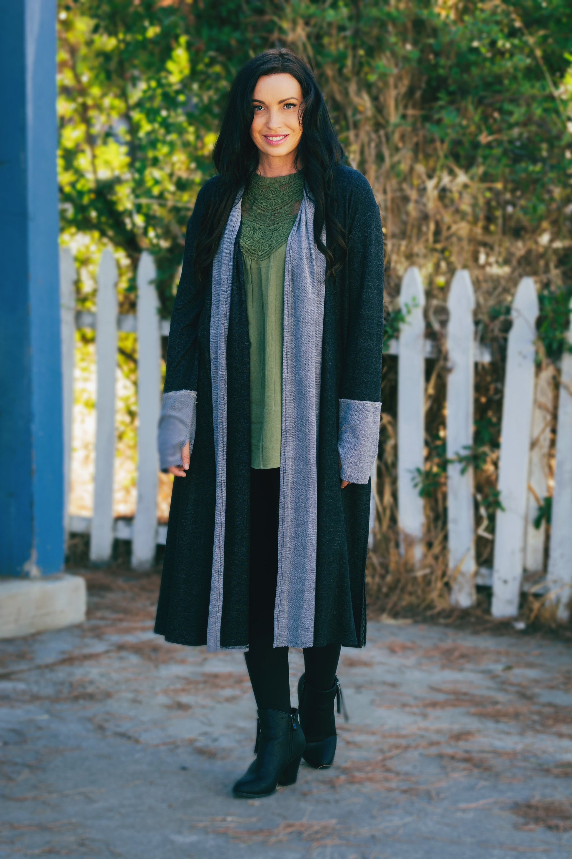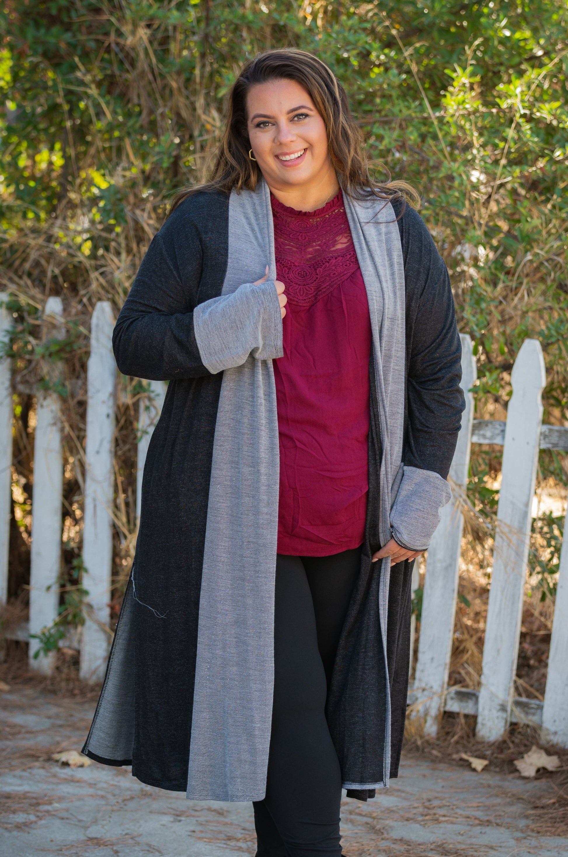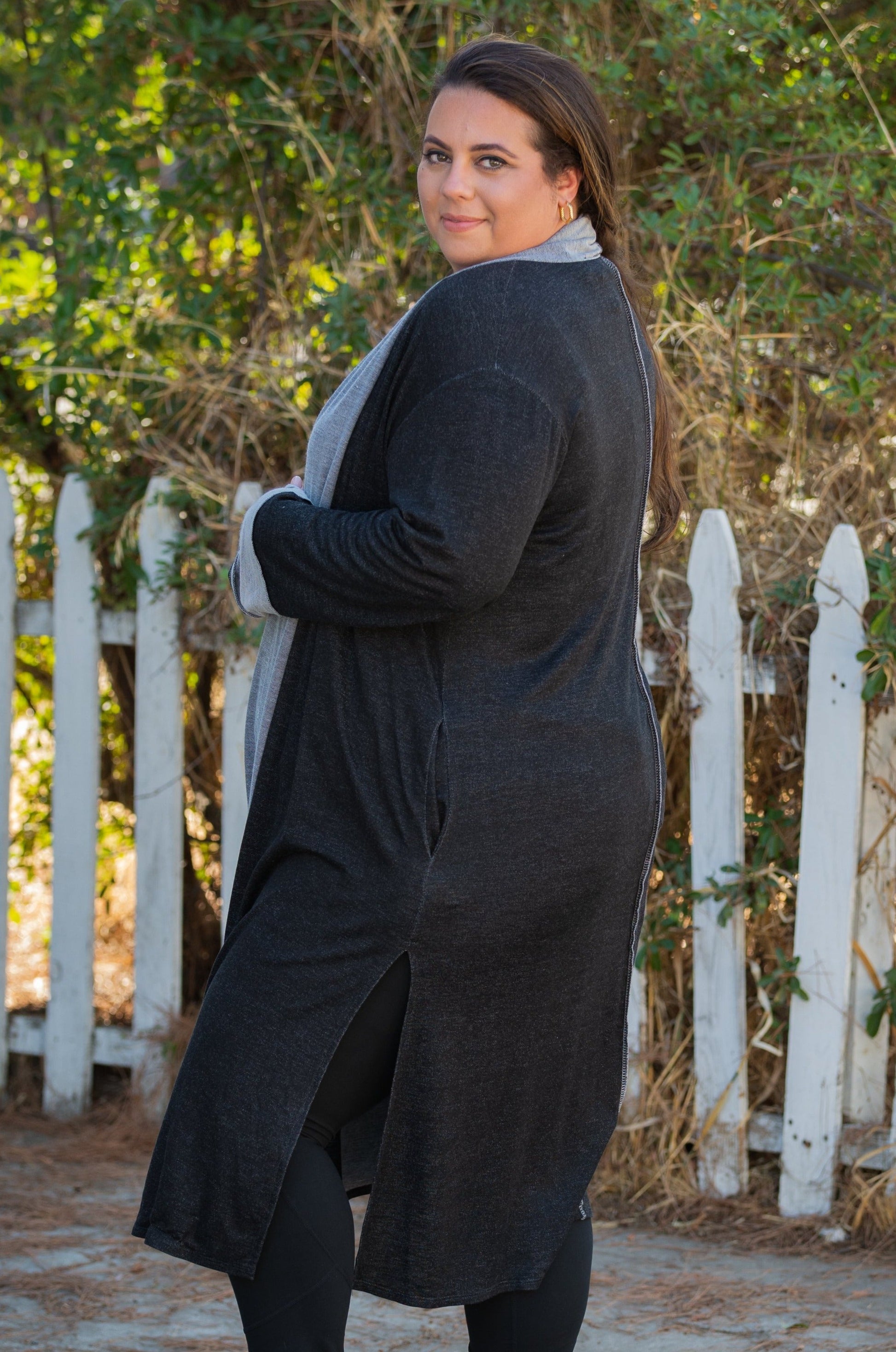 This thumbhole duster was inspired the epitome of beauty. We are loving the two tone in this cardigan, which makes it so easy to pair with just about anything. With a relaxed fit, this duster features an open fold over face, overlock reverse stitching details, font pockets and side slits.