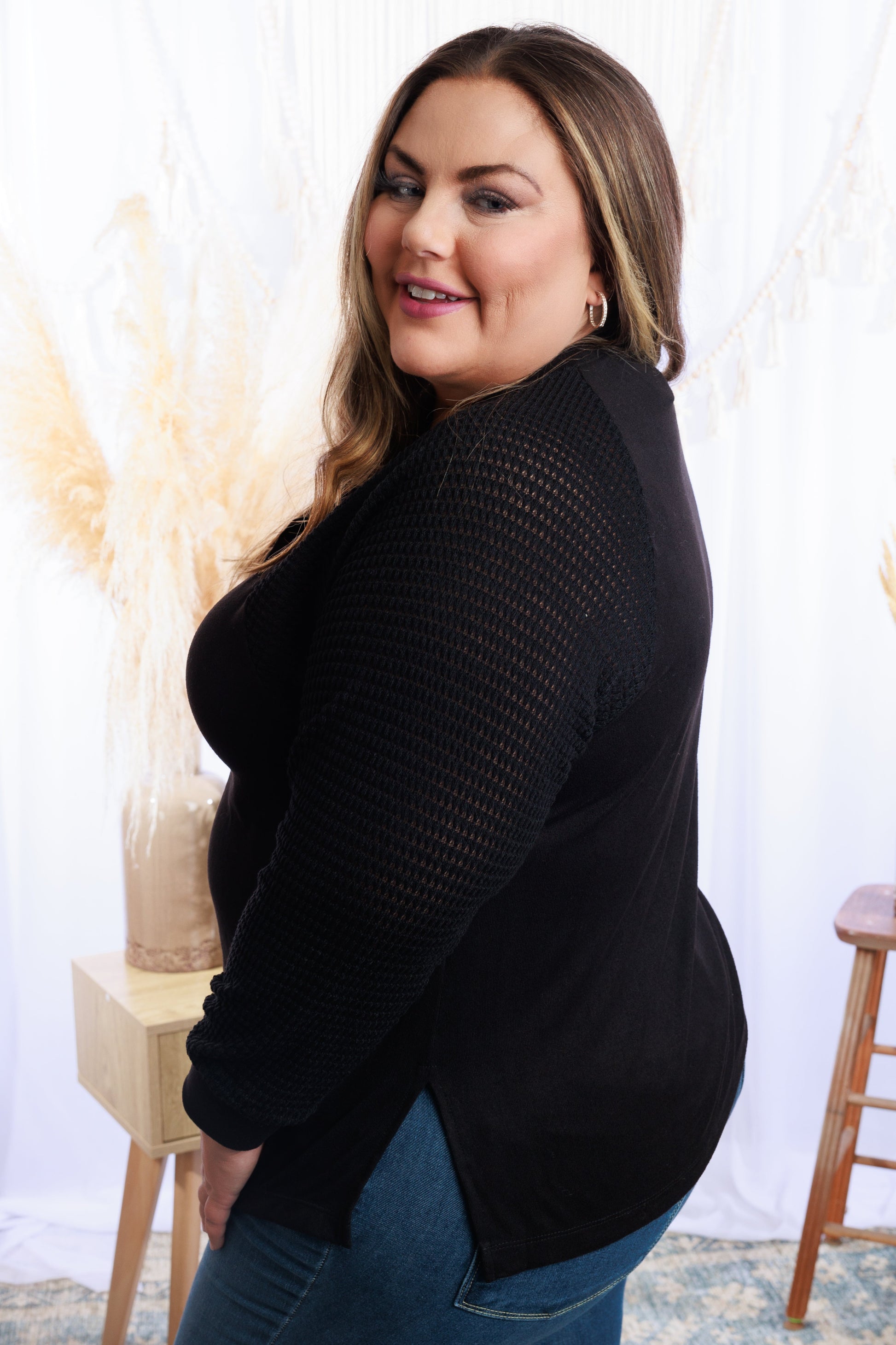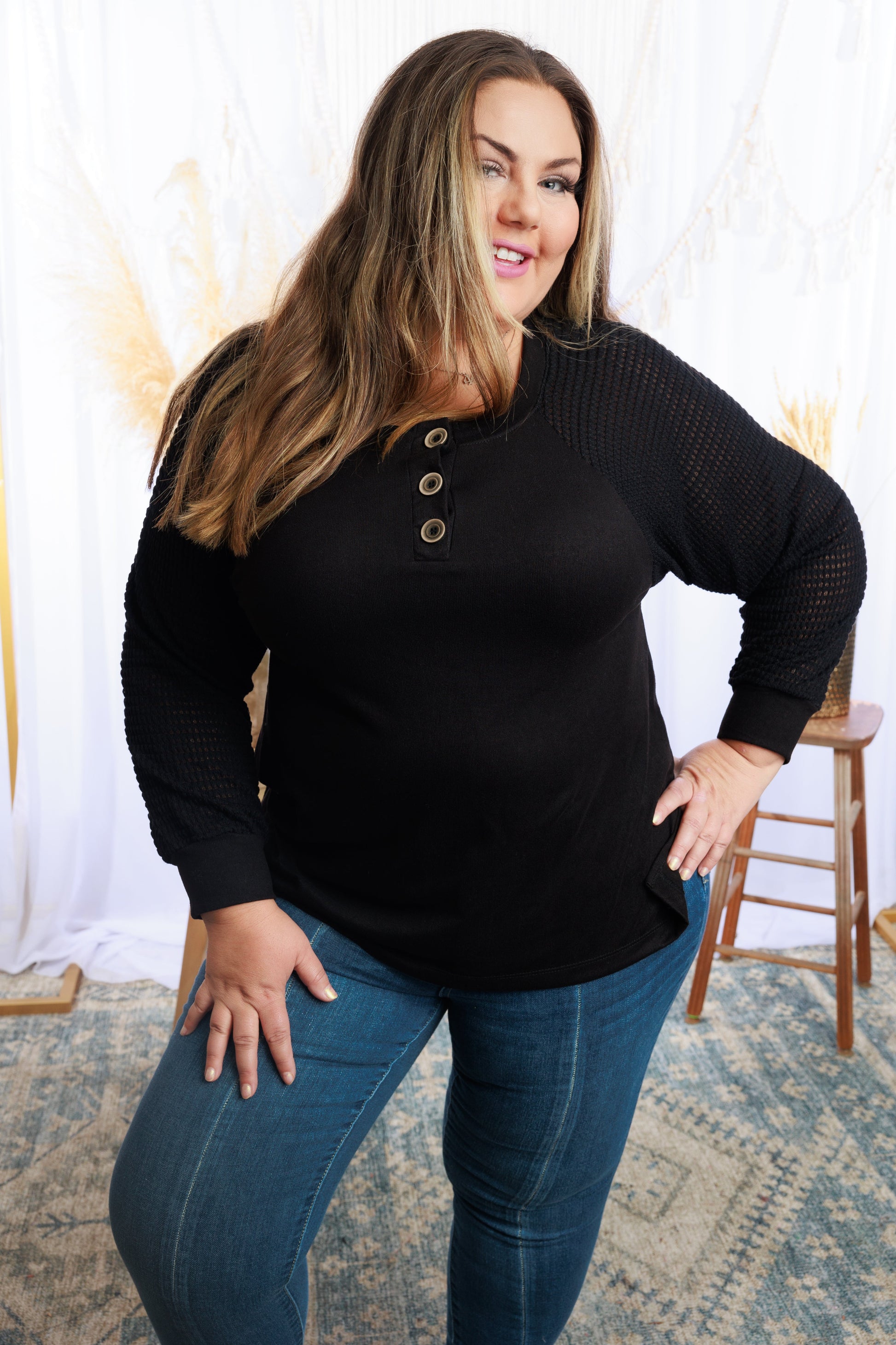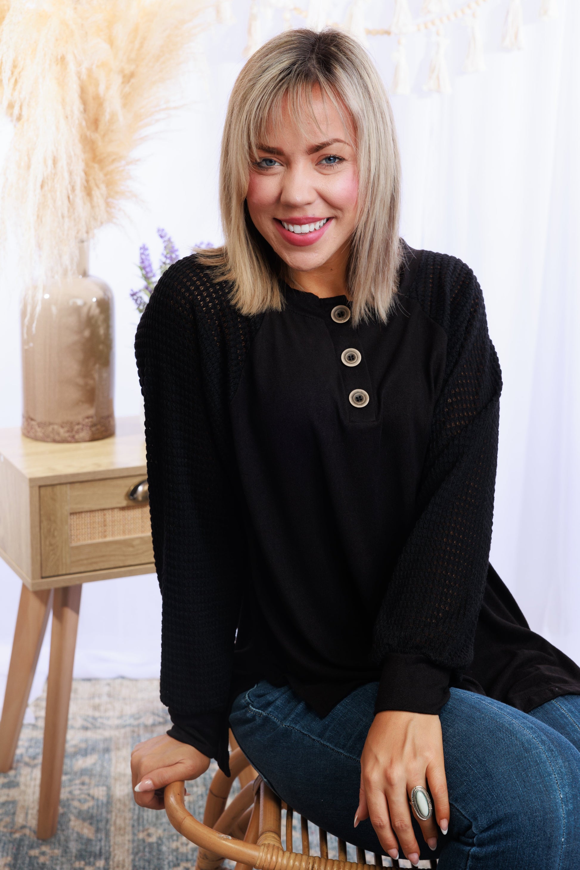 You and this cozy, half-button raglan will be instant BFFs! Our comfy-casual design has long waffle knit sleeves, for a relaxed fit that invites you to come on in and get to know Let's Get Together!