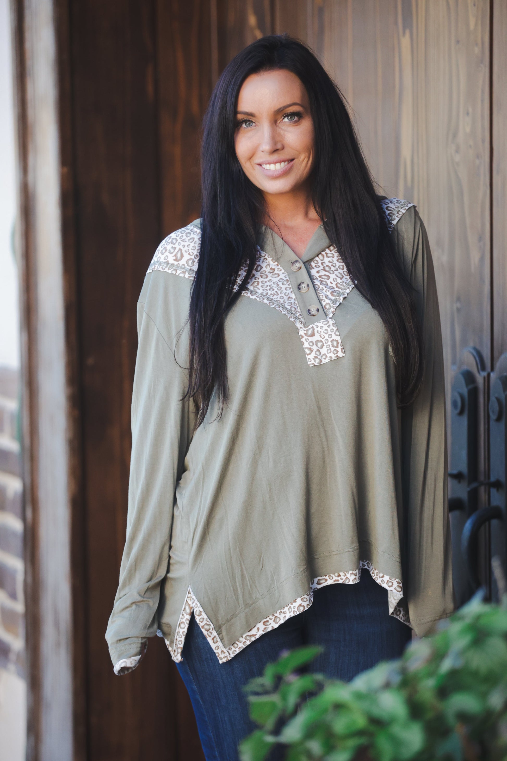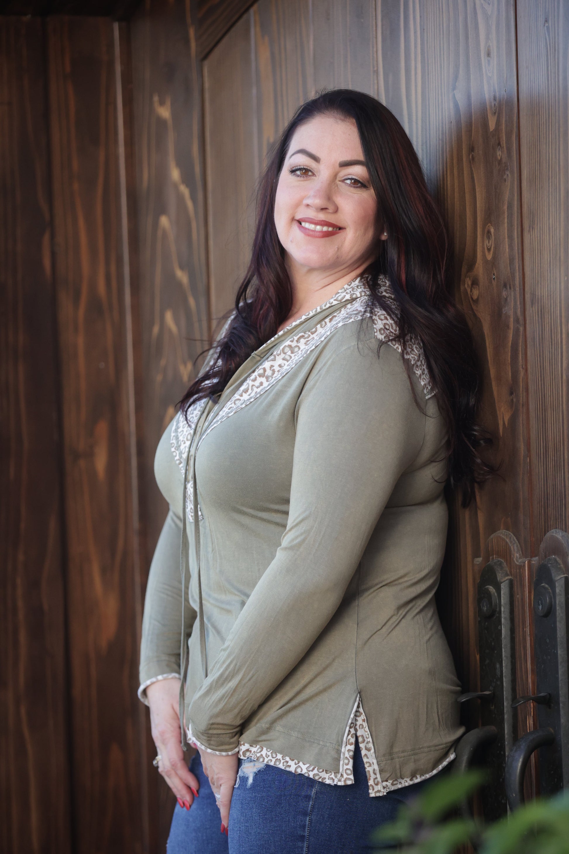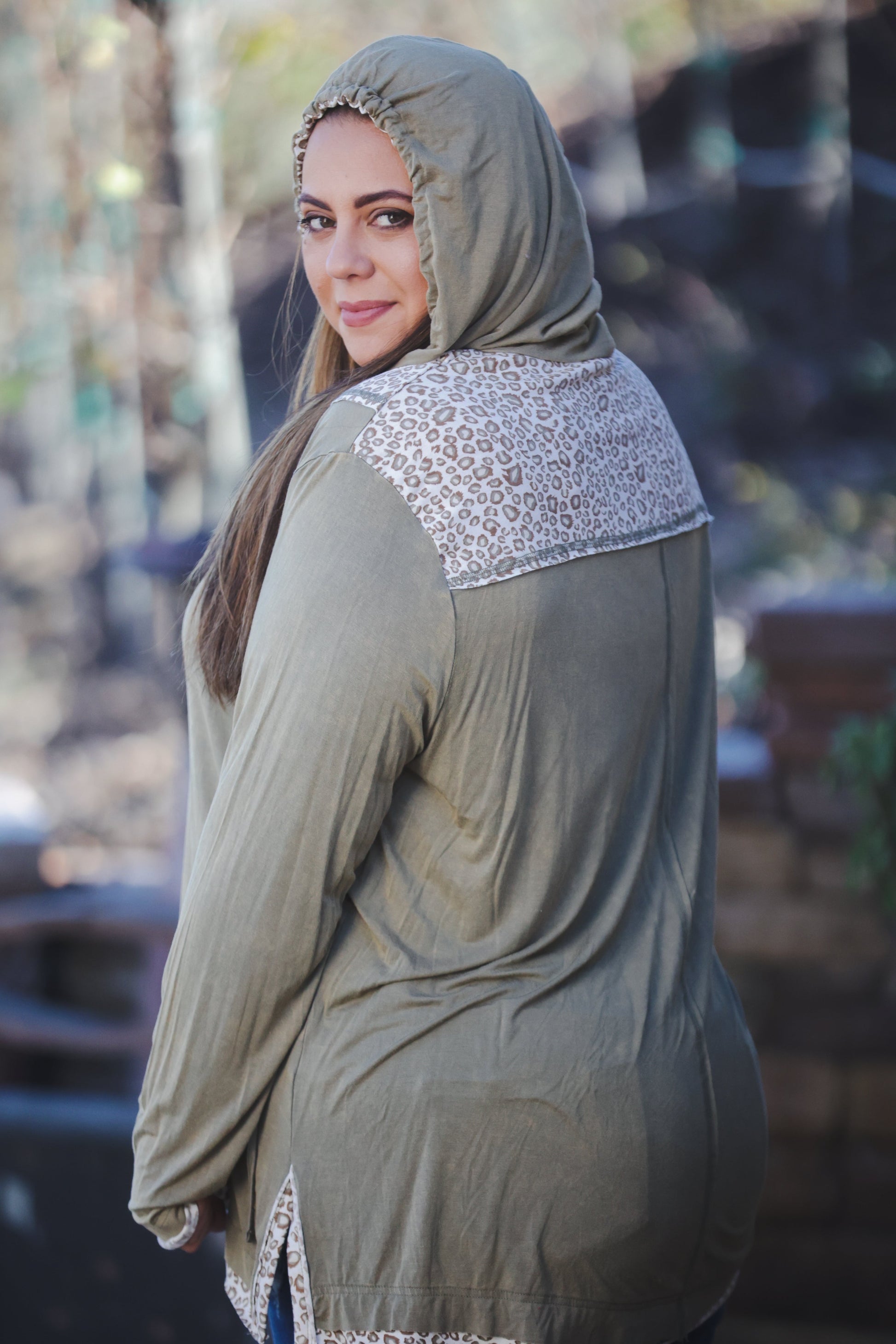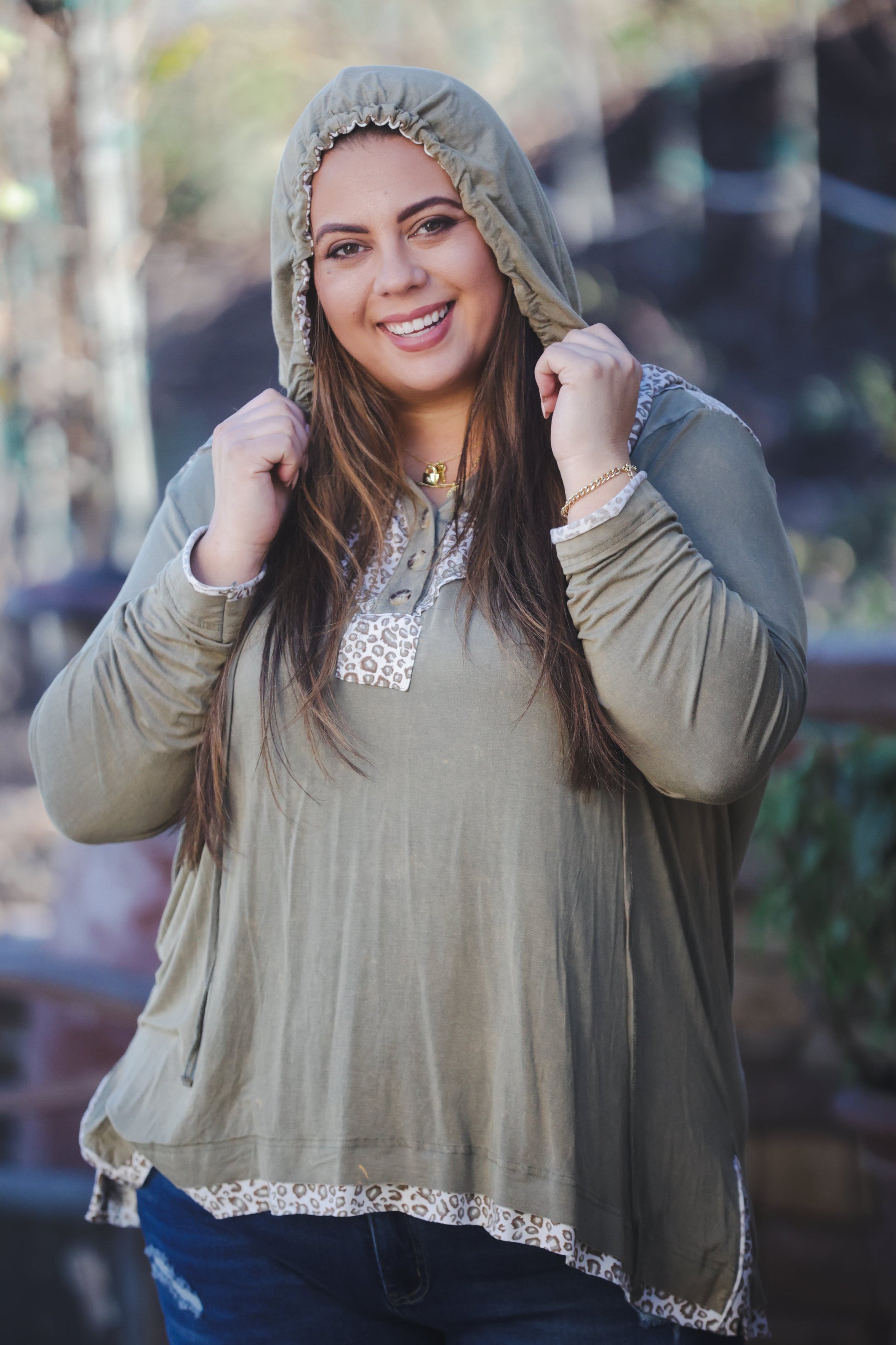 Bring on those martinis with this fun and sassy olive hoodie. With a relaxed fit, this top features functional front buttons, functioning drawstring layered hi-lo hem.