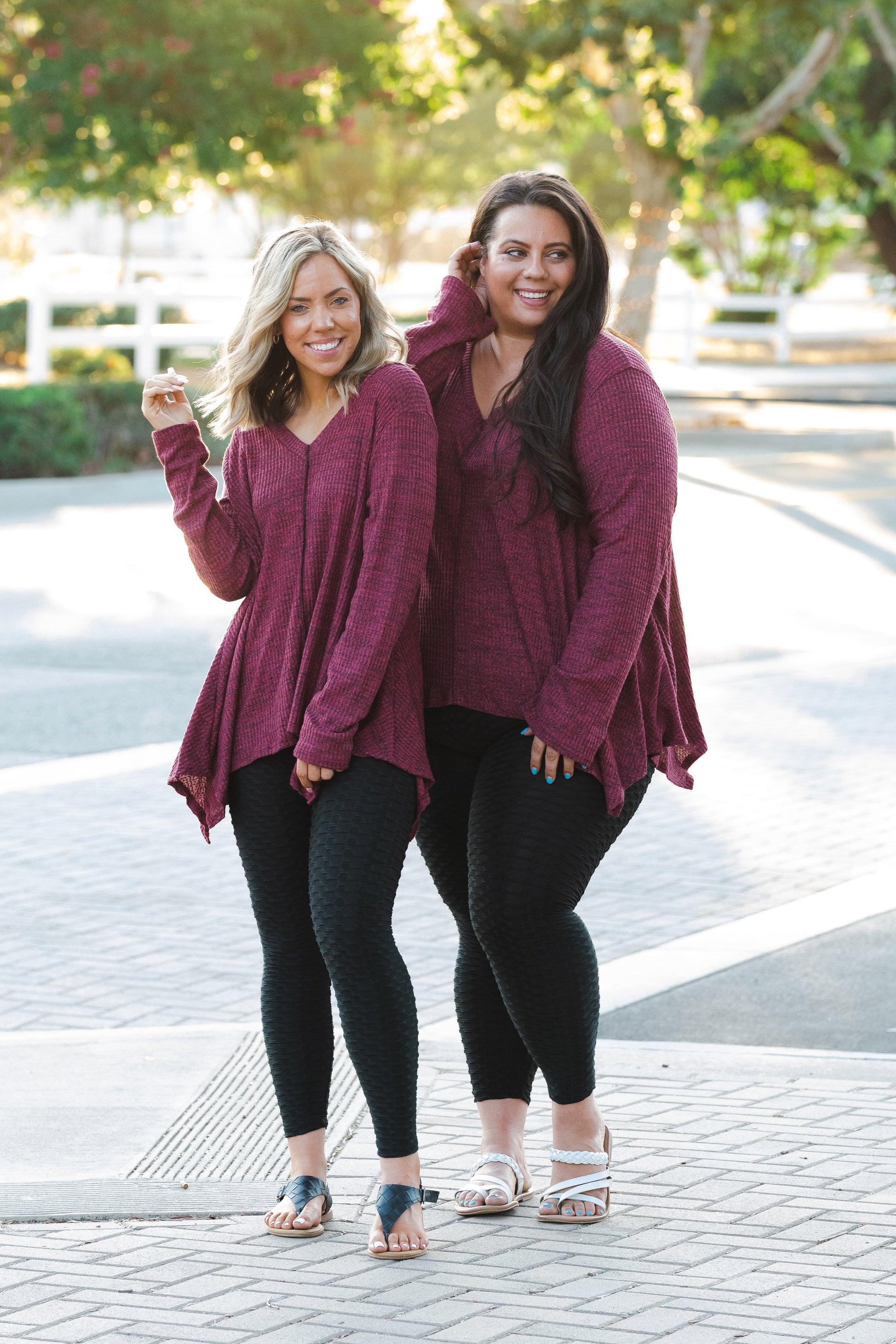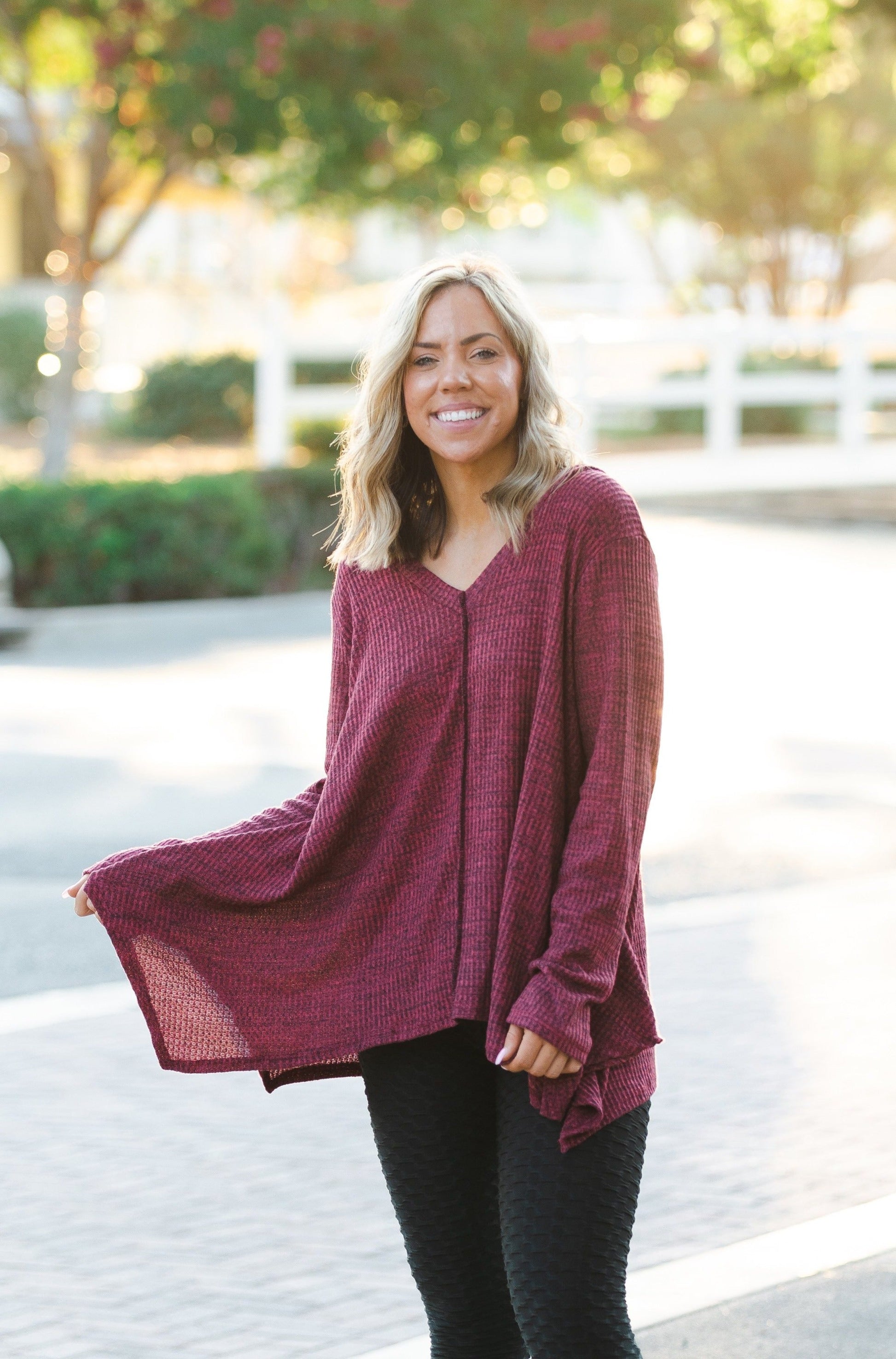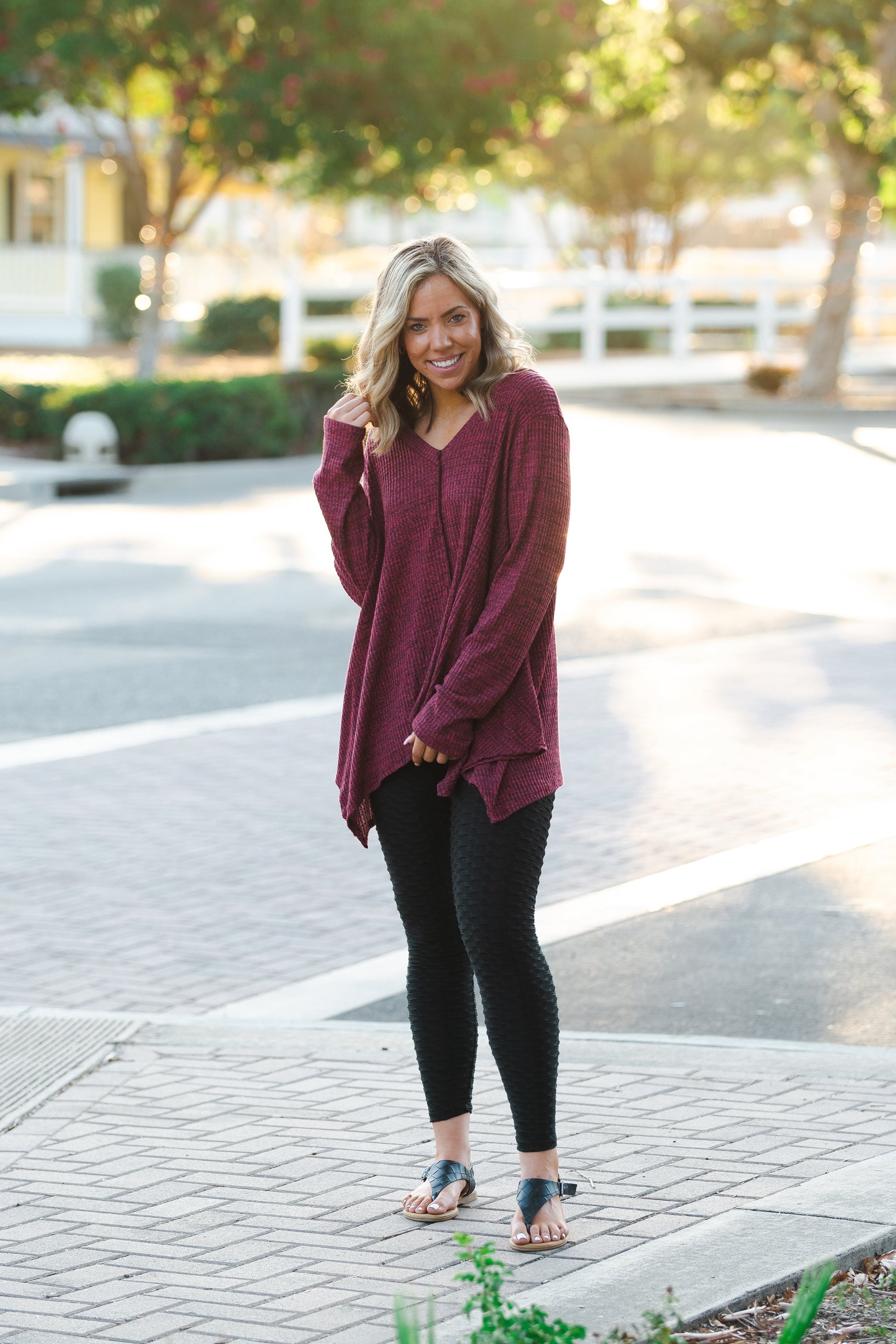 Talk about comfort meets style, this top has it all! Made from the softest brushed waffle knit, this to p features a v-neck, long sleeves, reverse stitch details and a sharkbite hem.