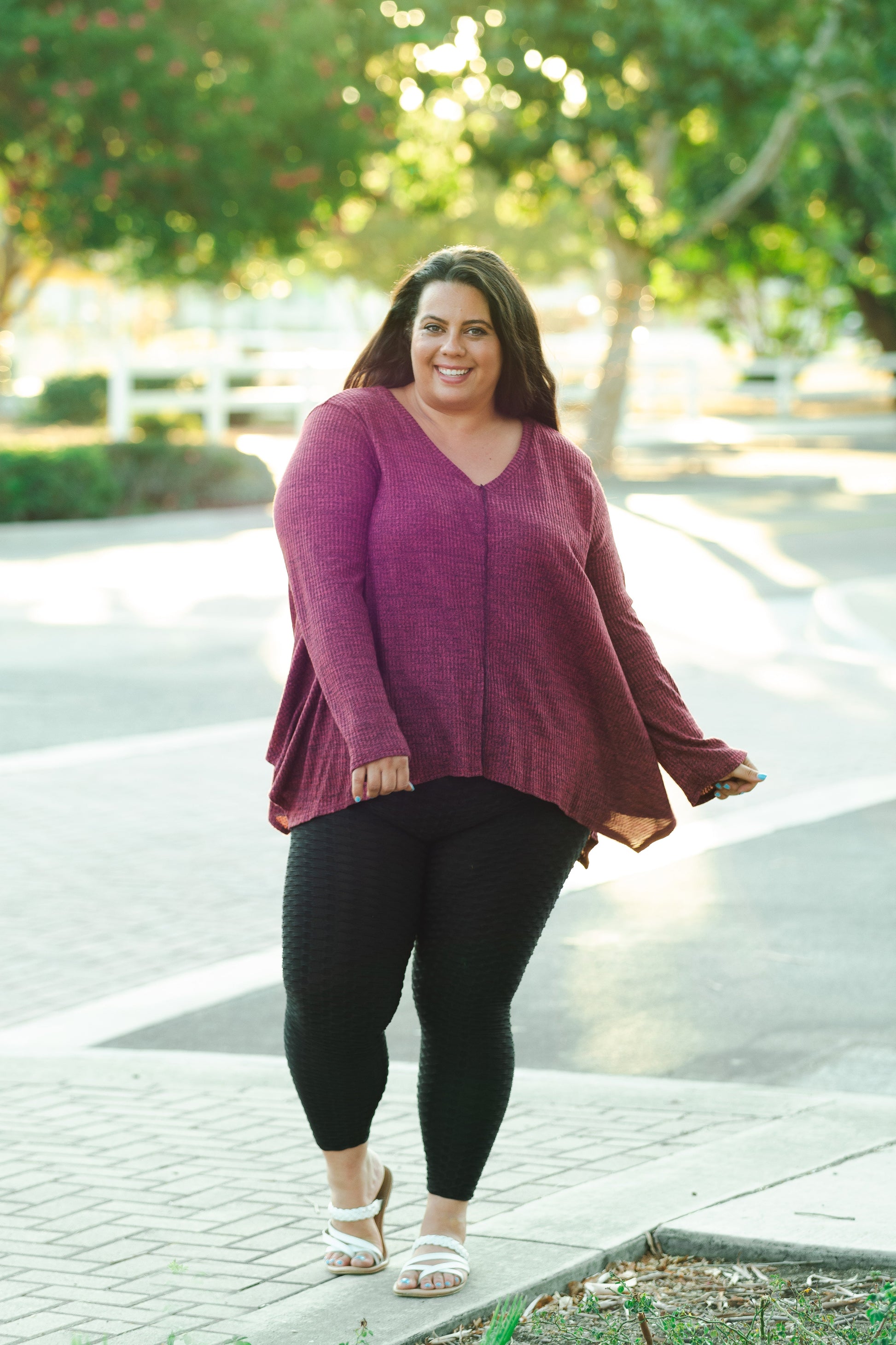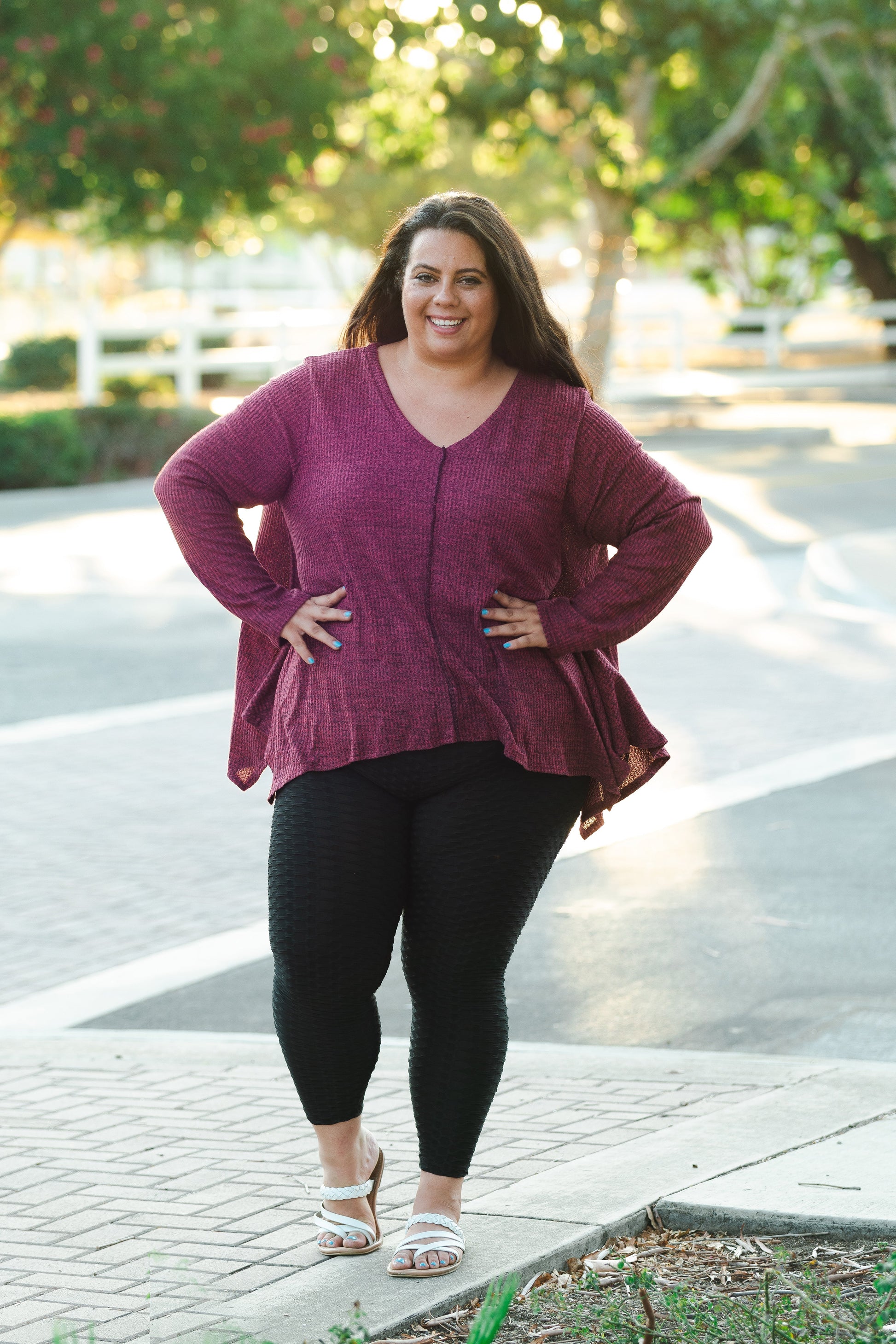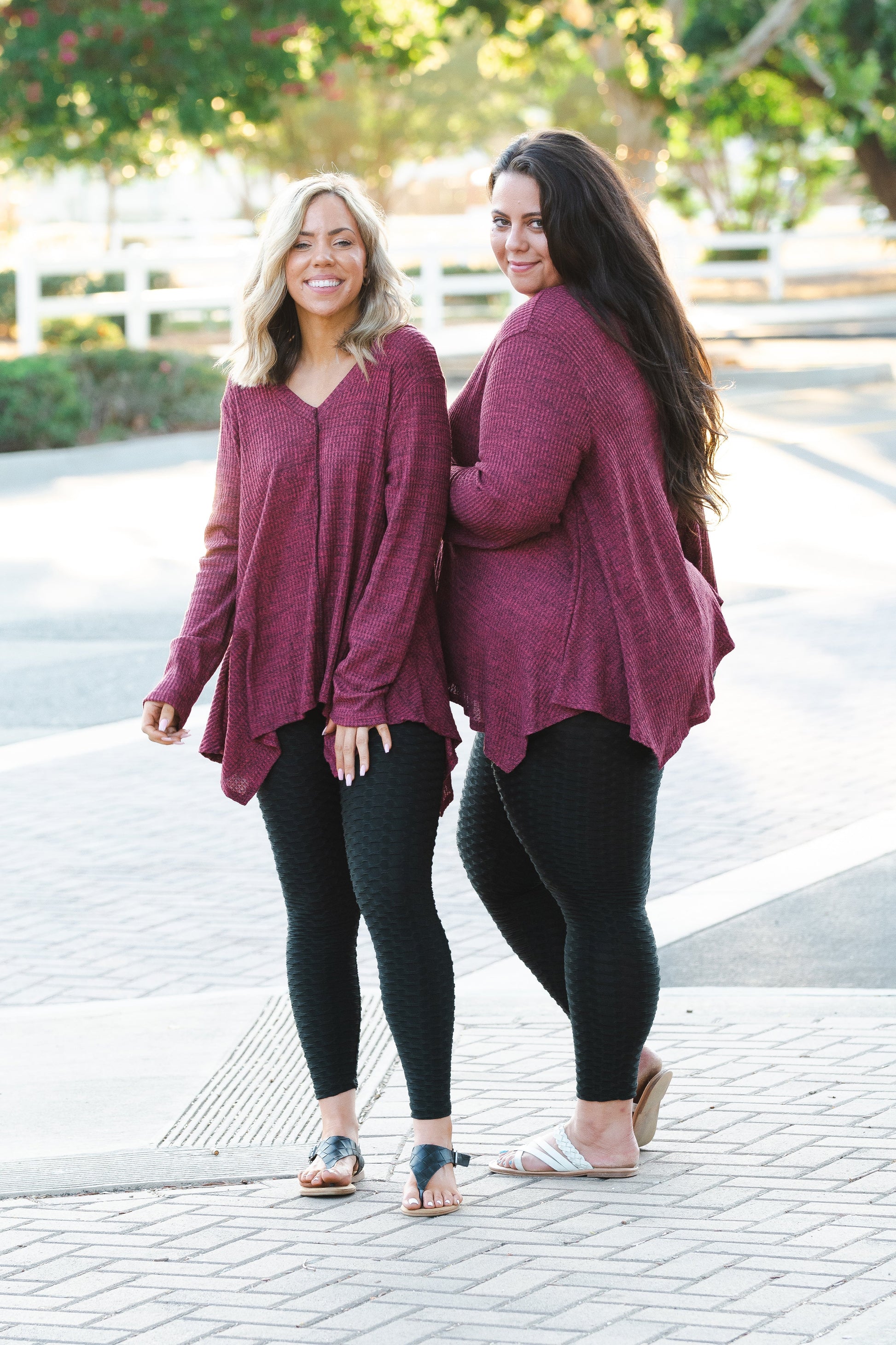 Talk about comfort meets style, this top has it all! Made from the softest brushed waffle knit, this to p features a v-neck, long sleeves, reverse stitch details and a sharkbite hem.