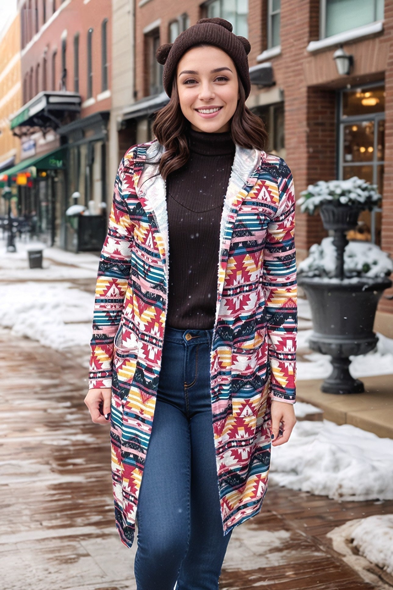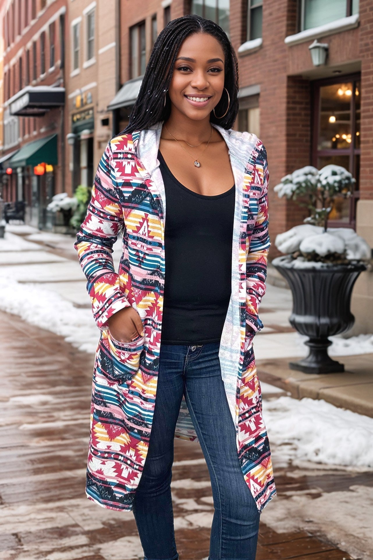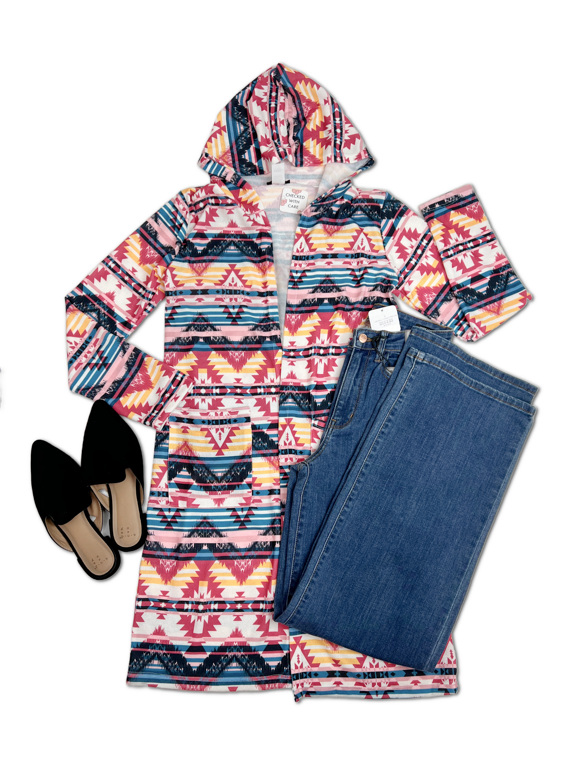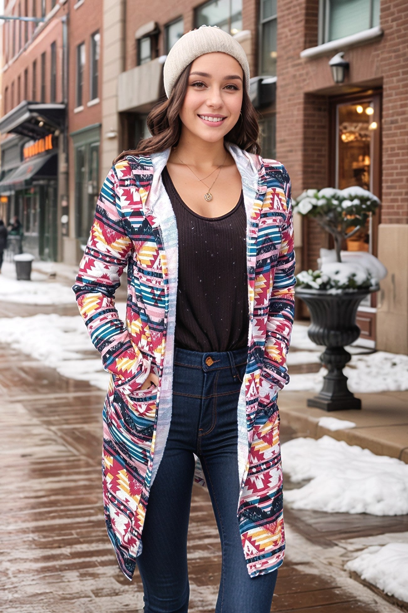 Get ready to rock your style with the Midnight In Austin cardigan! This long-sleeve, hooded duster features a colorful Aztec print that will make you stand out in any crowd. Perfect for chilly nights or adding a pop of color to any outfit. Don't miss out on this must-have piece!