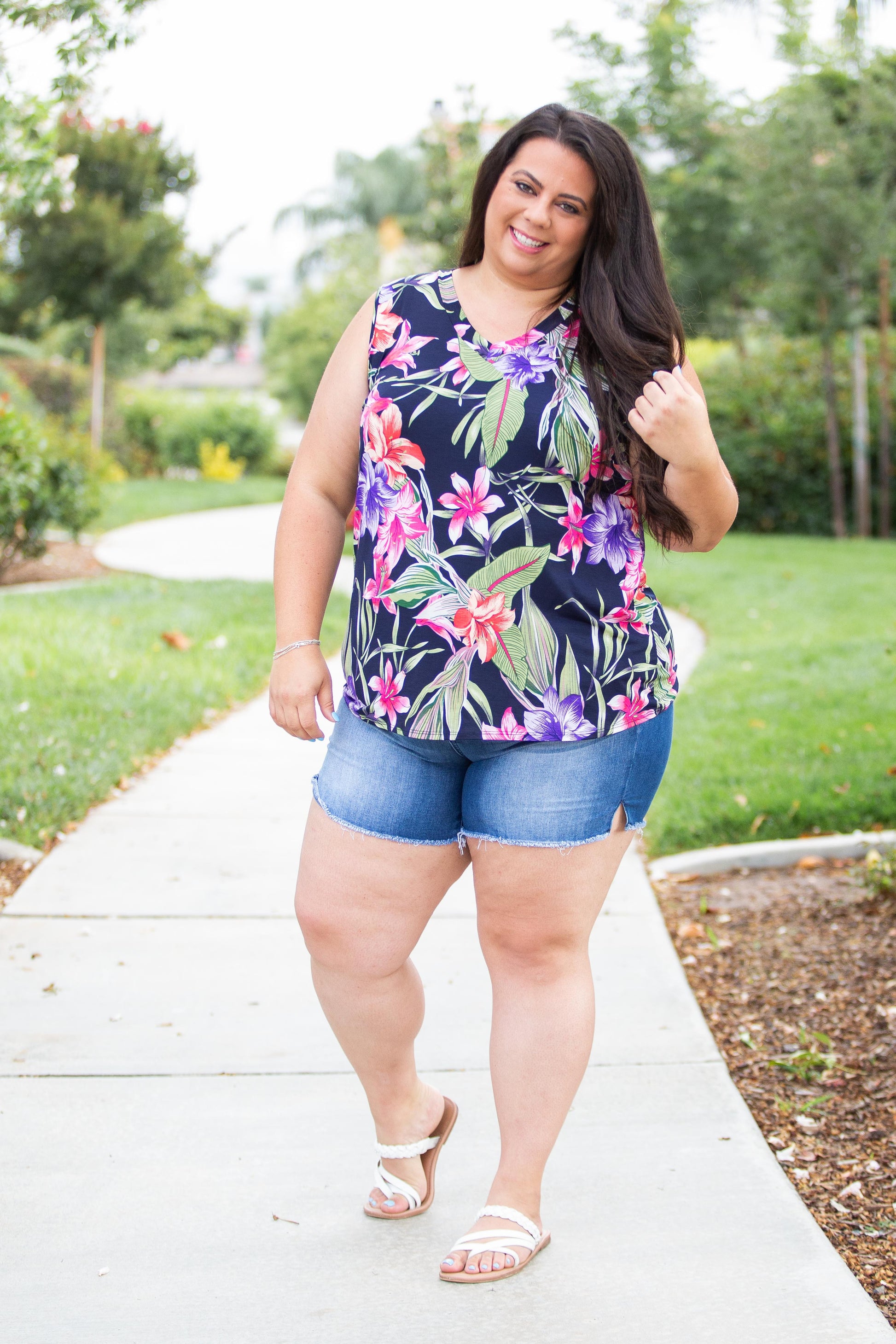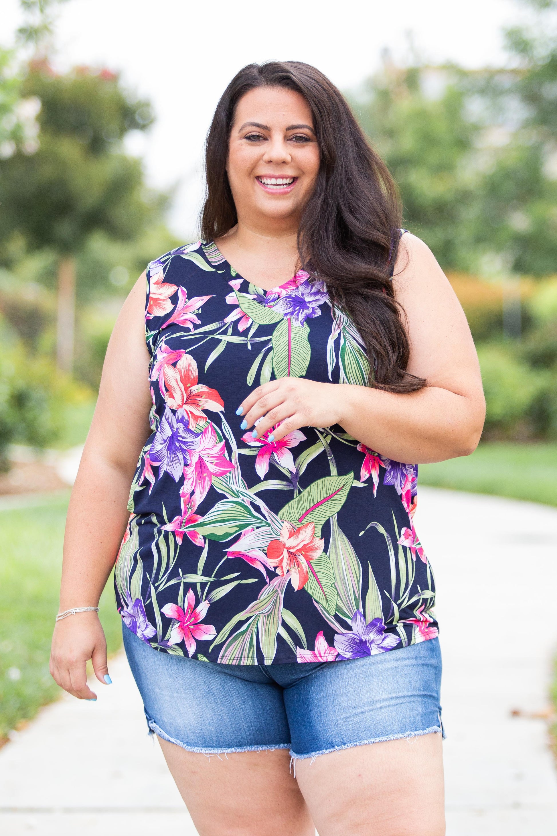 This sleeveless top is so fun and unique. We're loving how those tropical flowers pop against the dark navy background. With a relaxed fit, this top features a v-neck and rounded hem.