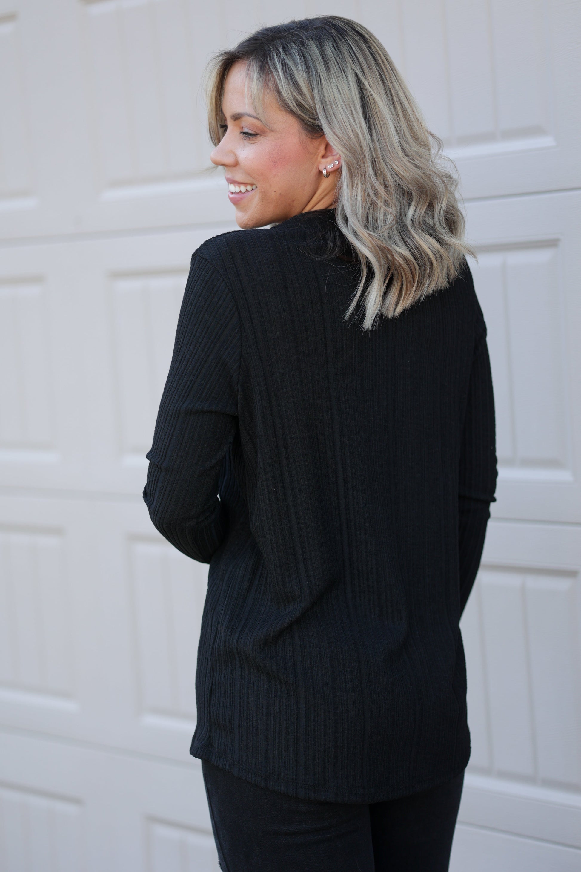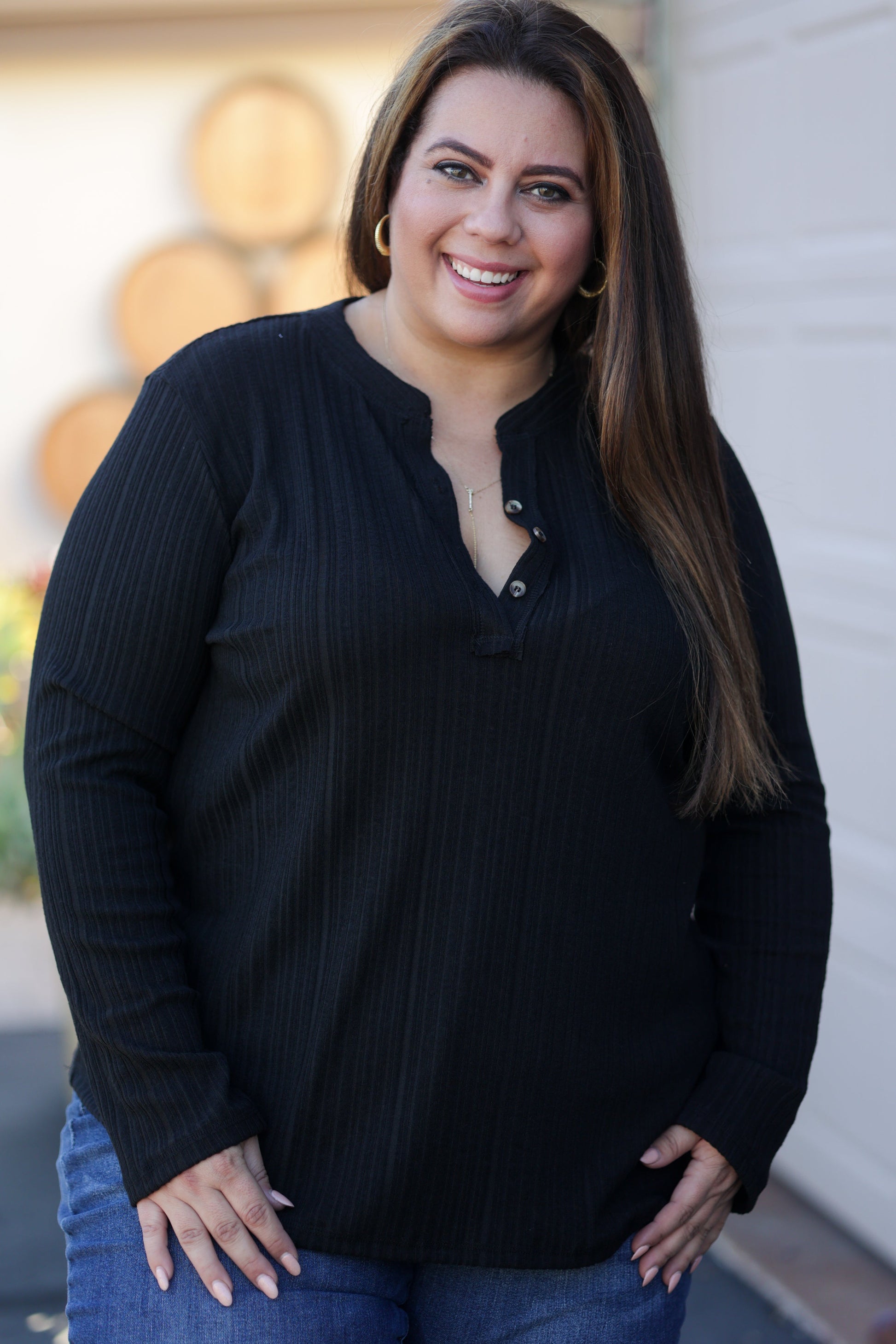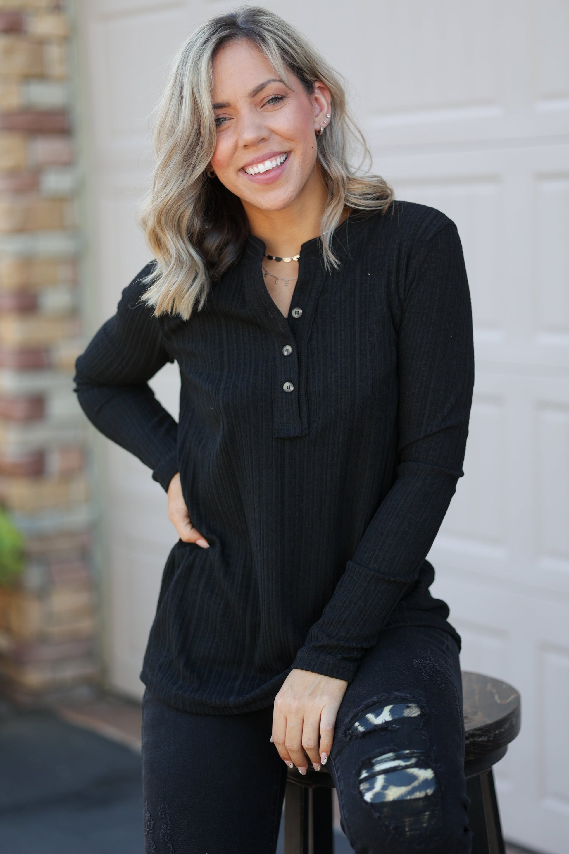 This black knit long sleeve top is the perfect top to escape the everyday grind with. Made from a soft stretchy lightweight sweater material, this top will keep you both cozy and fashionable. With a relaxed fit, this top features a notched neckline with functioning buttons and long sleeves.