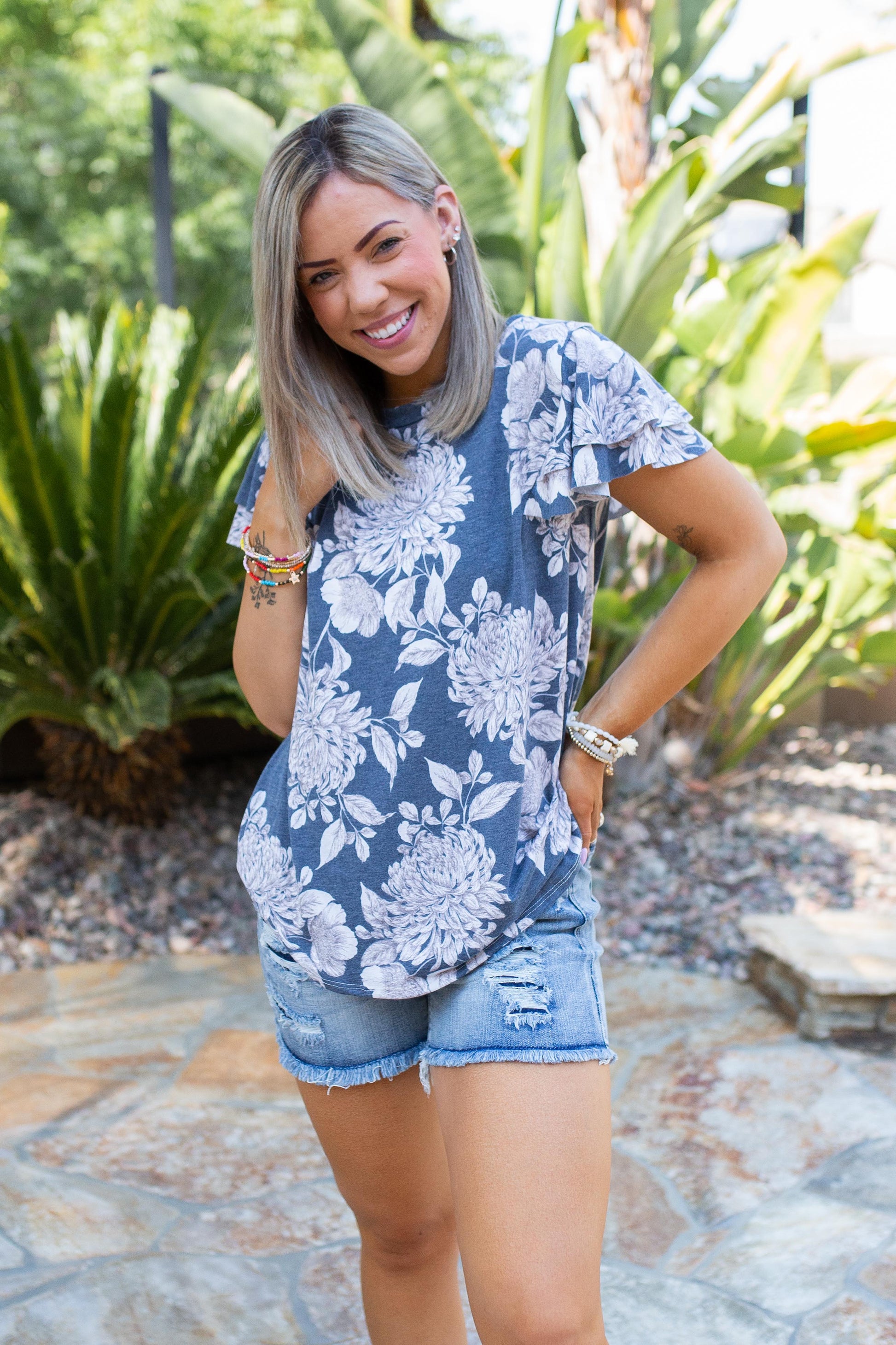 This amazingly soft short sleeve ruffle top is the perfect addition to your wardrobe. Such an easy piece to dress up or down. With a relaxed fit, this top features a round neckline and short ruffled sleeves.