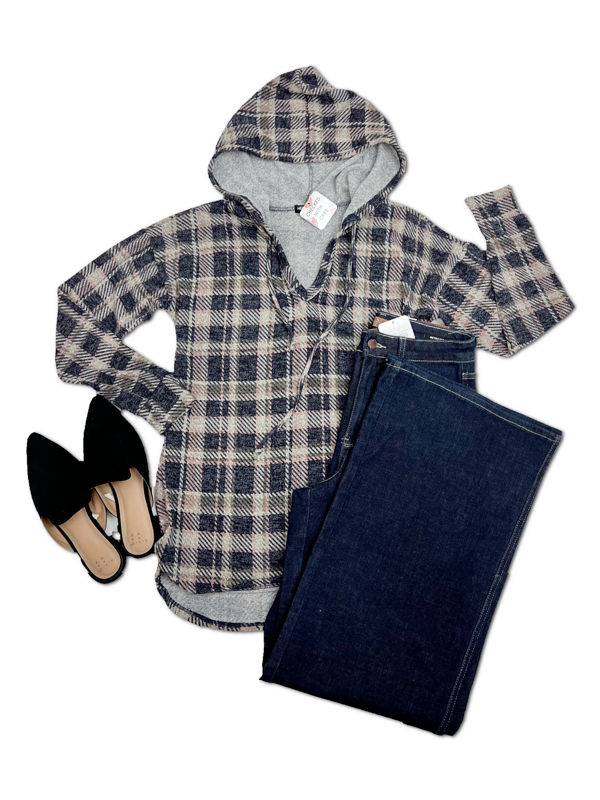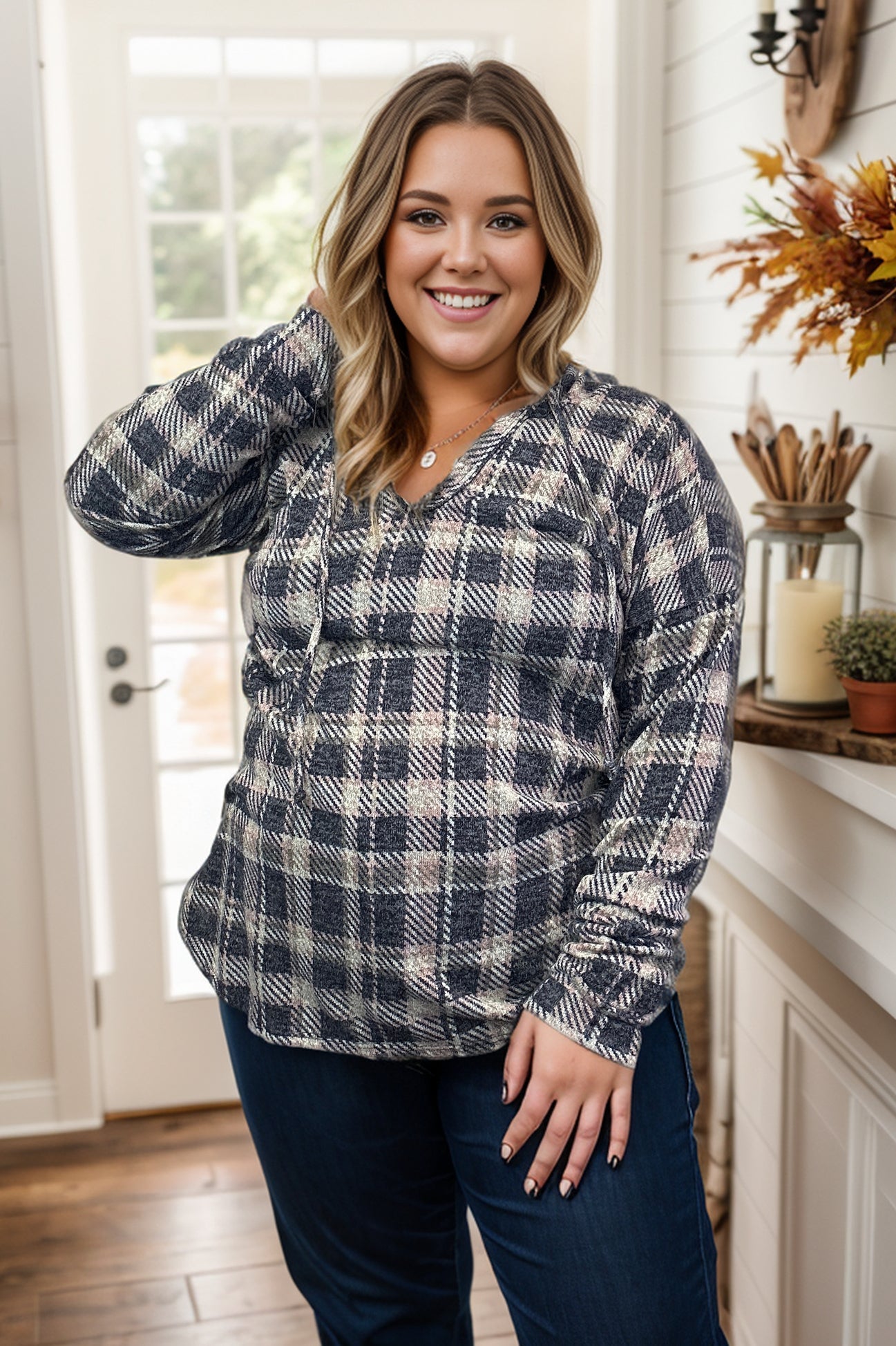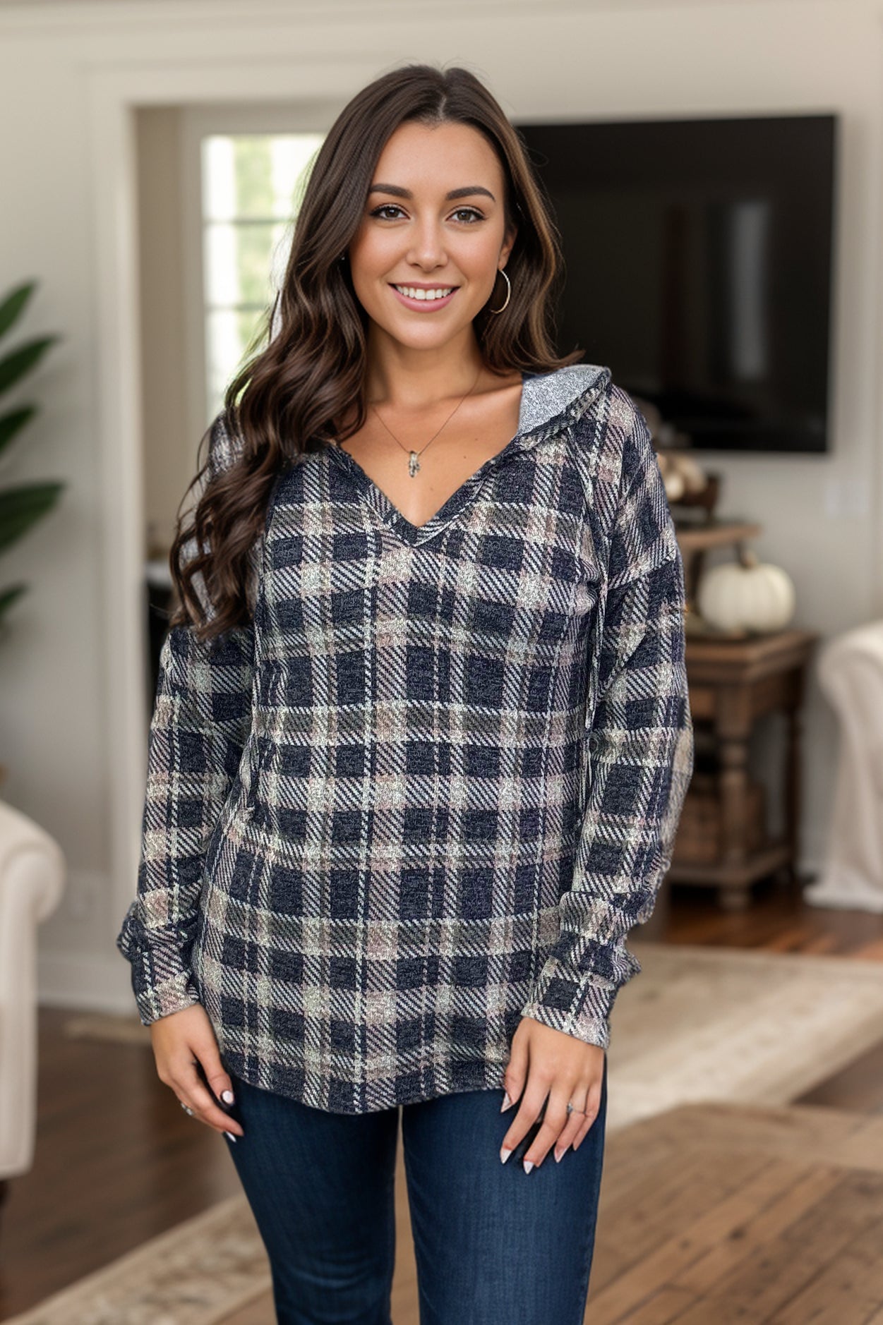 Stay cozy and stylish with our River At Dawn Hoodie. Made with hacci knit fabric and featuring a unique dolphin hem, this hoodie keeps you comfortable and on-trend. The navy plaid design adds a touch of charm while the v-neck and hood with drawstring offer versatility. Perfect for any day, any time. (Hood up or hood down.)