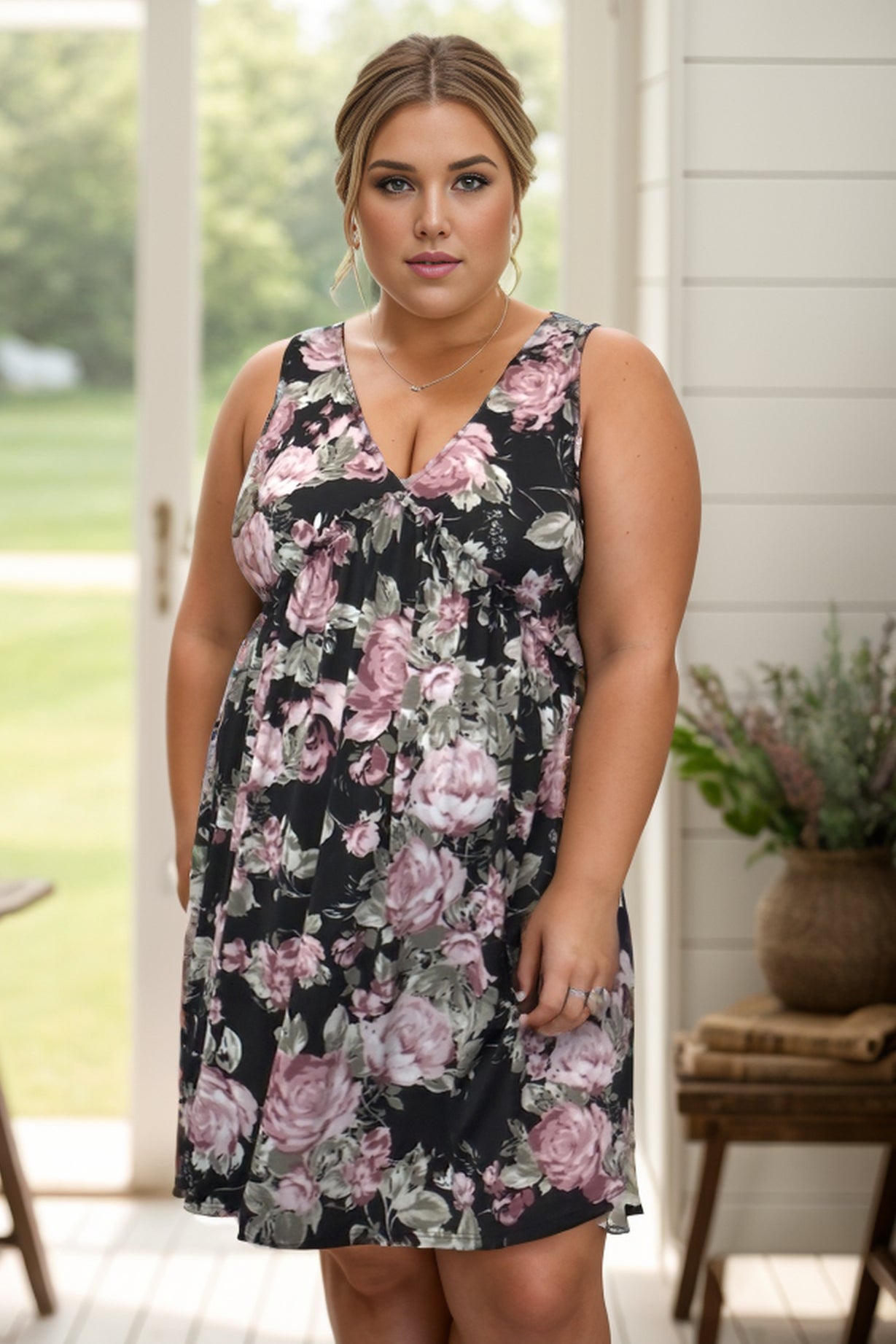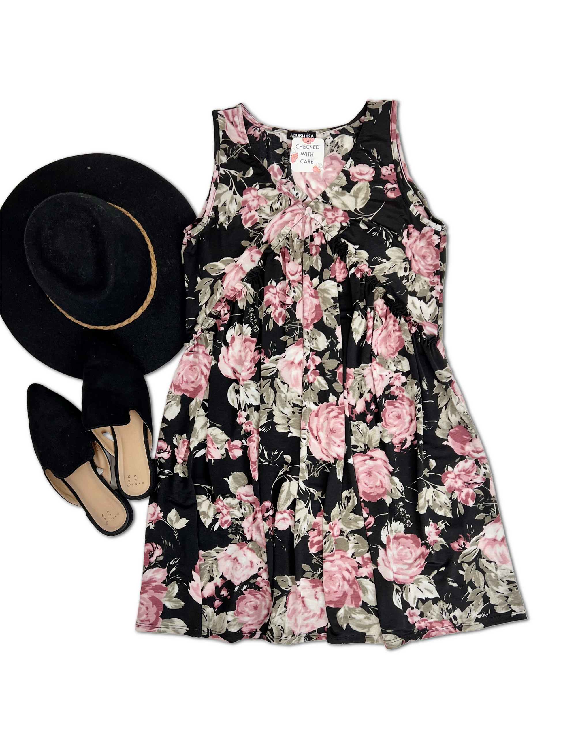 Stay shady and stylish with Roses in the Night - Swing Dress. This sleeveless dress features a flattering v-neck, playful ruffle trim, and convenient side pockets. The a-line silhouette is perfect for twirling (or sneaking snacks) all night long!