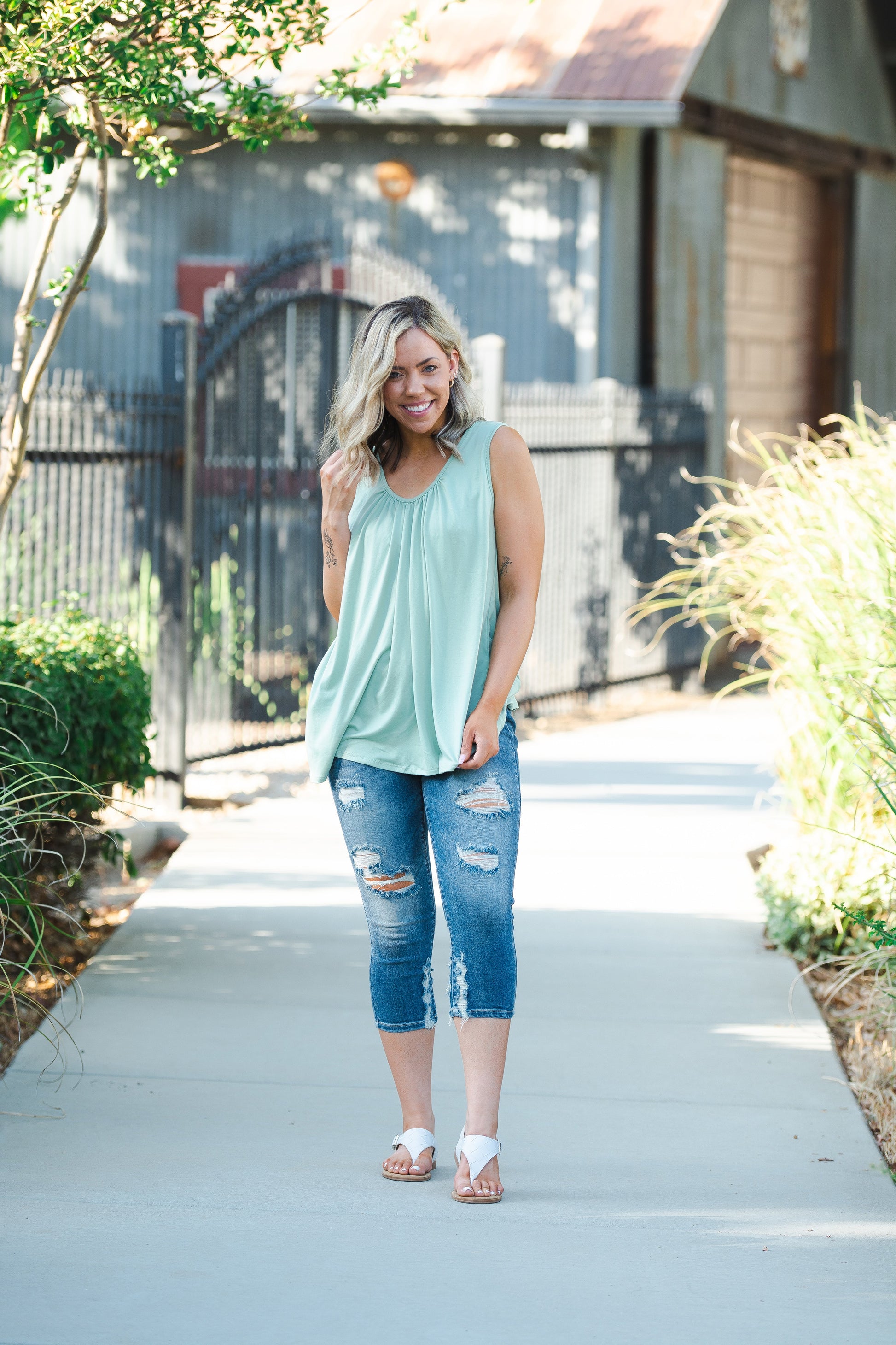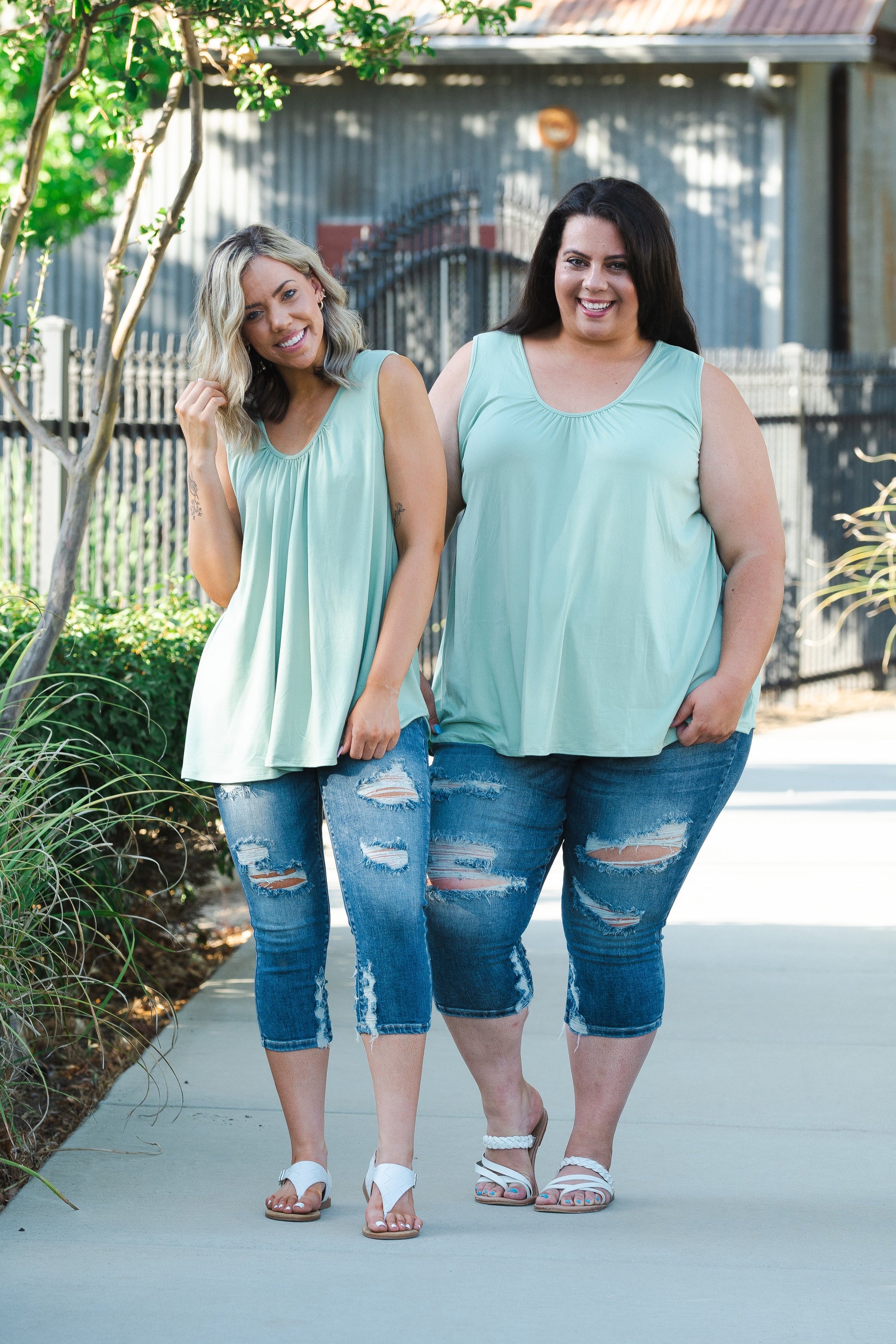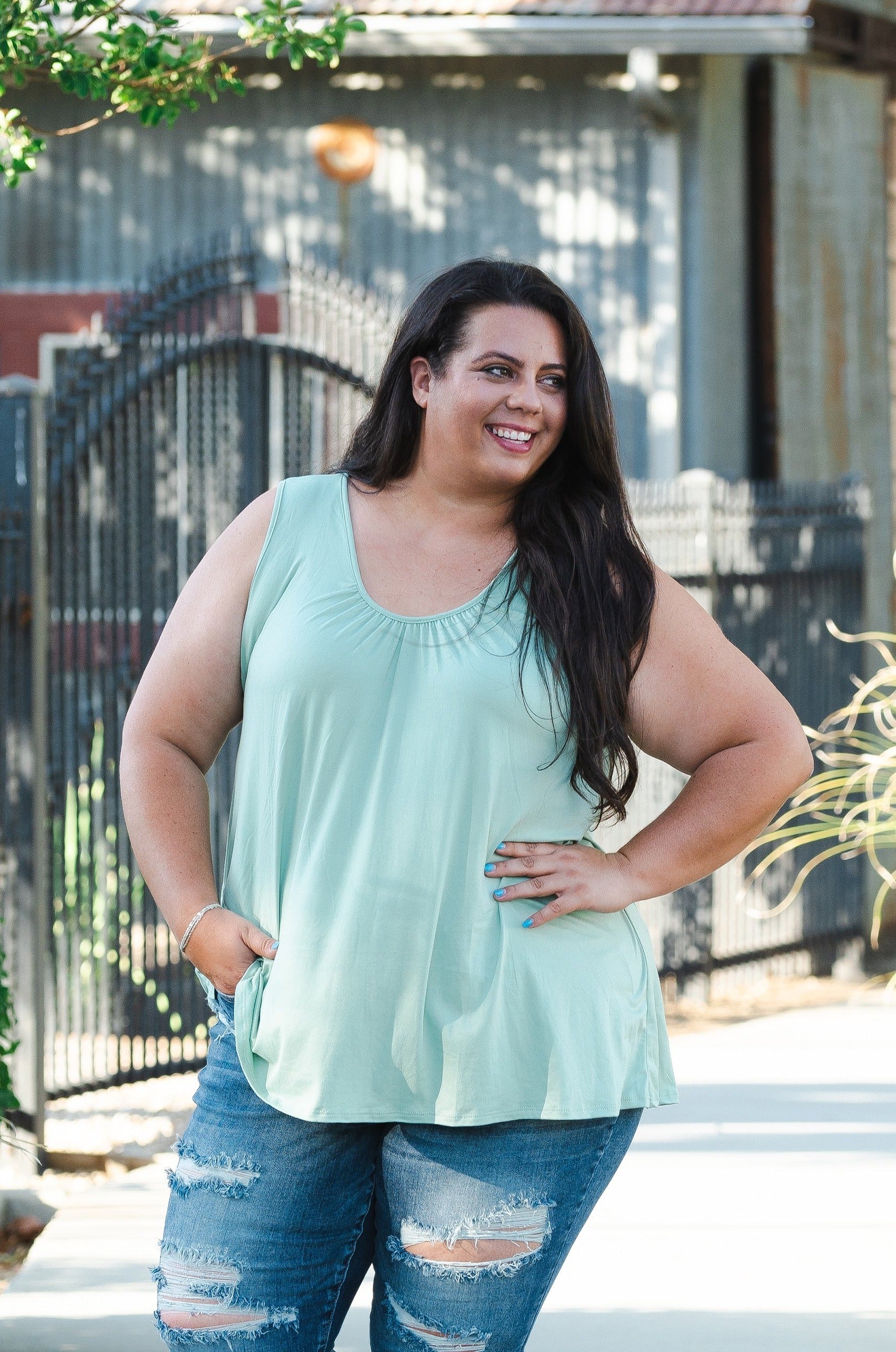 Made from the softest, butteriest fabric, this sleeveless top is great on it's own or layered under your favorite layering piece. With a relaxed, flowy fit, this top features a scoop neck with ruched details and rounded hem.