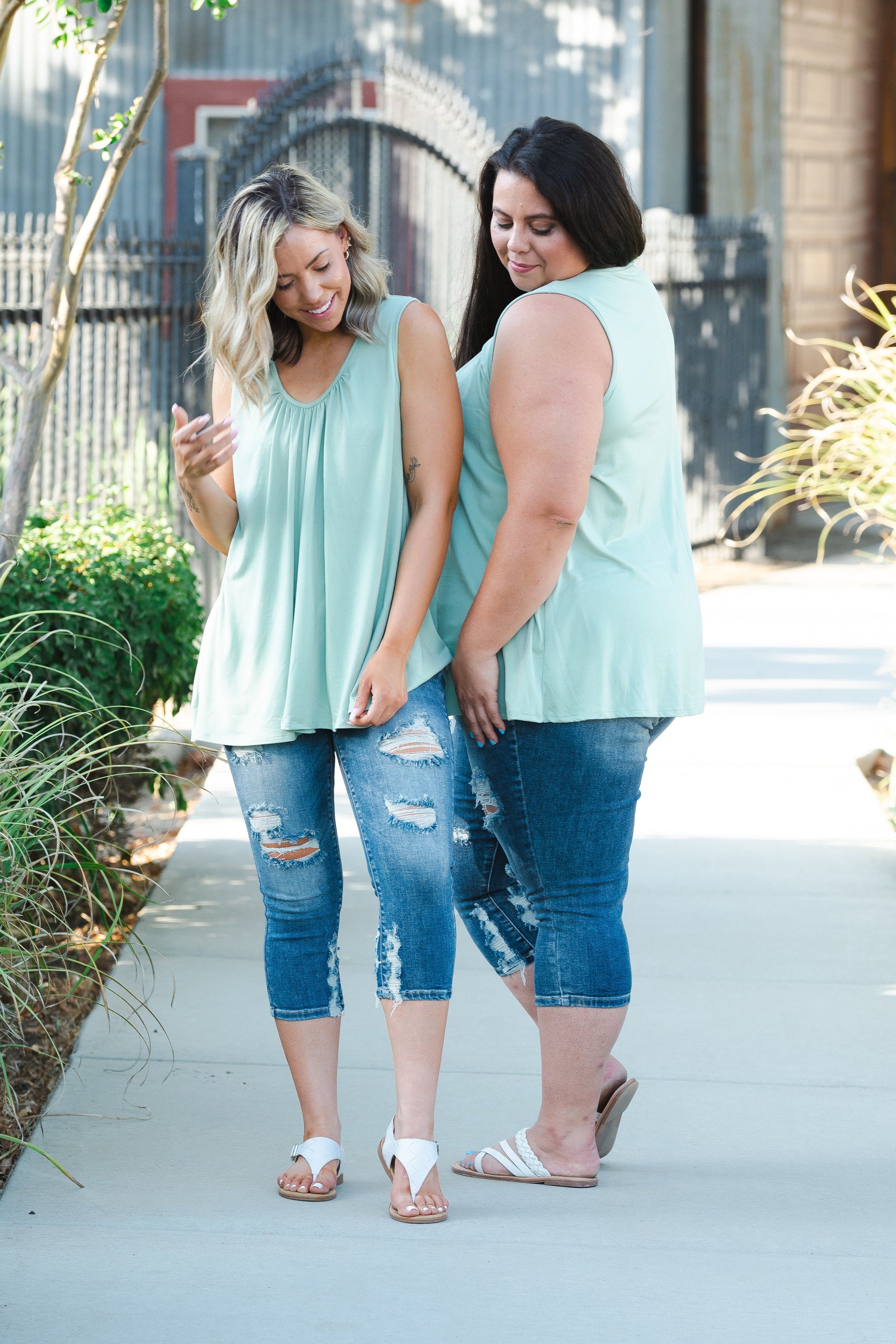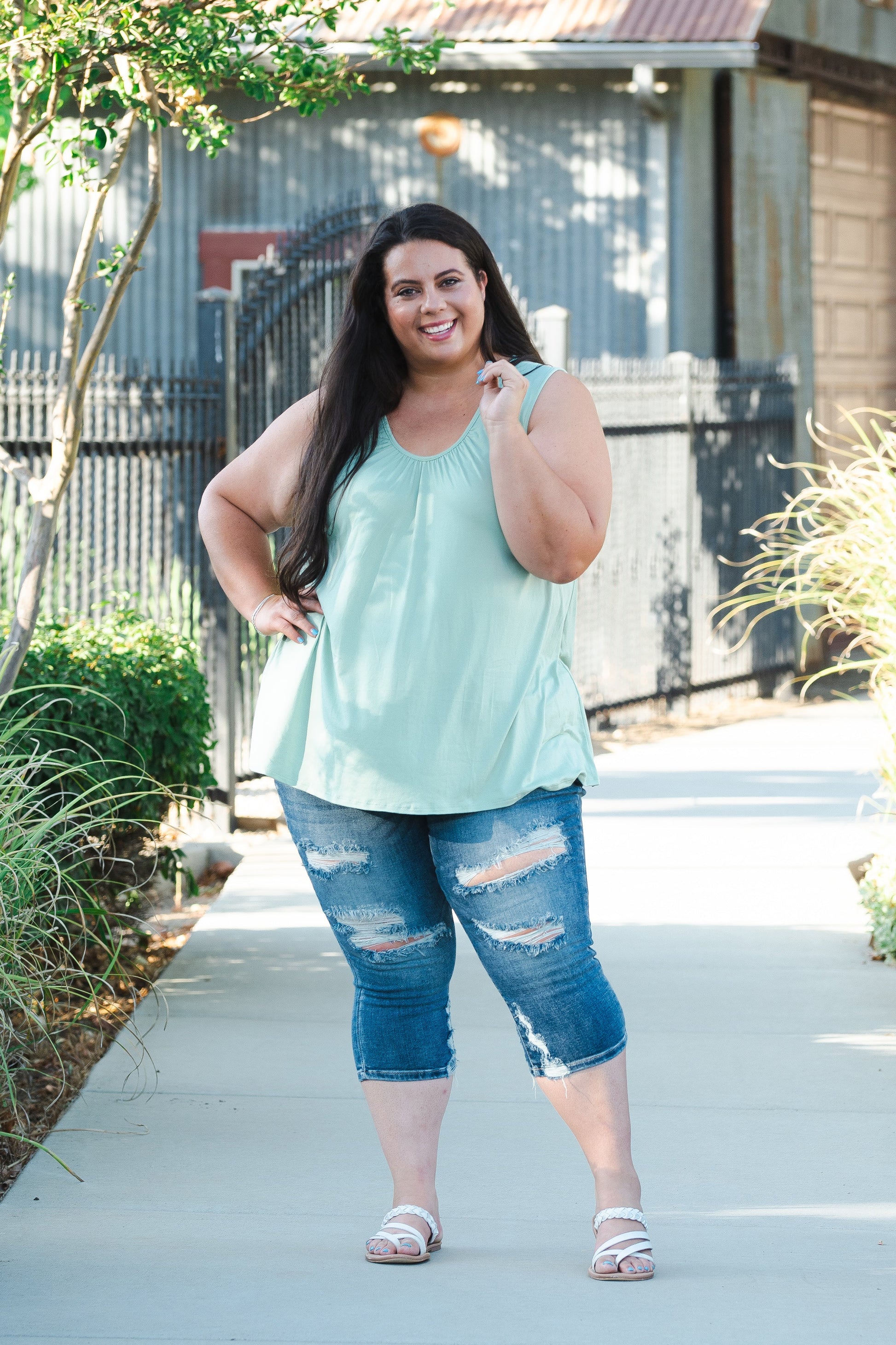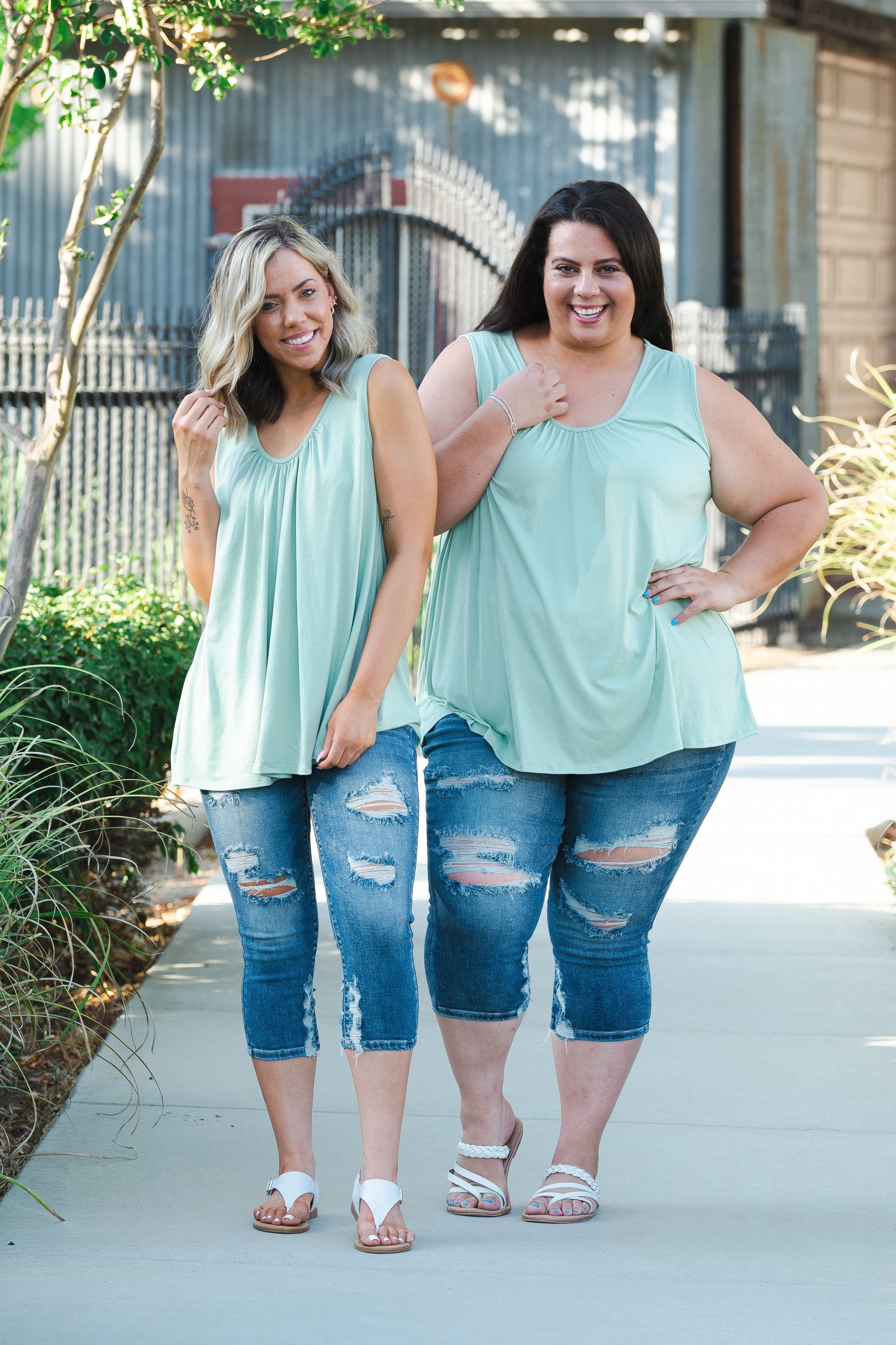 Made from the softest, butteriest fabric, this sleeveless top is great on it's own or layered under your favorite layering piece. With a relaxed, flowy fit, this top features a scoop neck with ruched details and rounded hem.